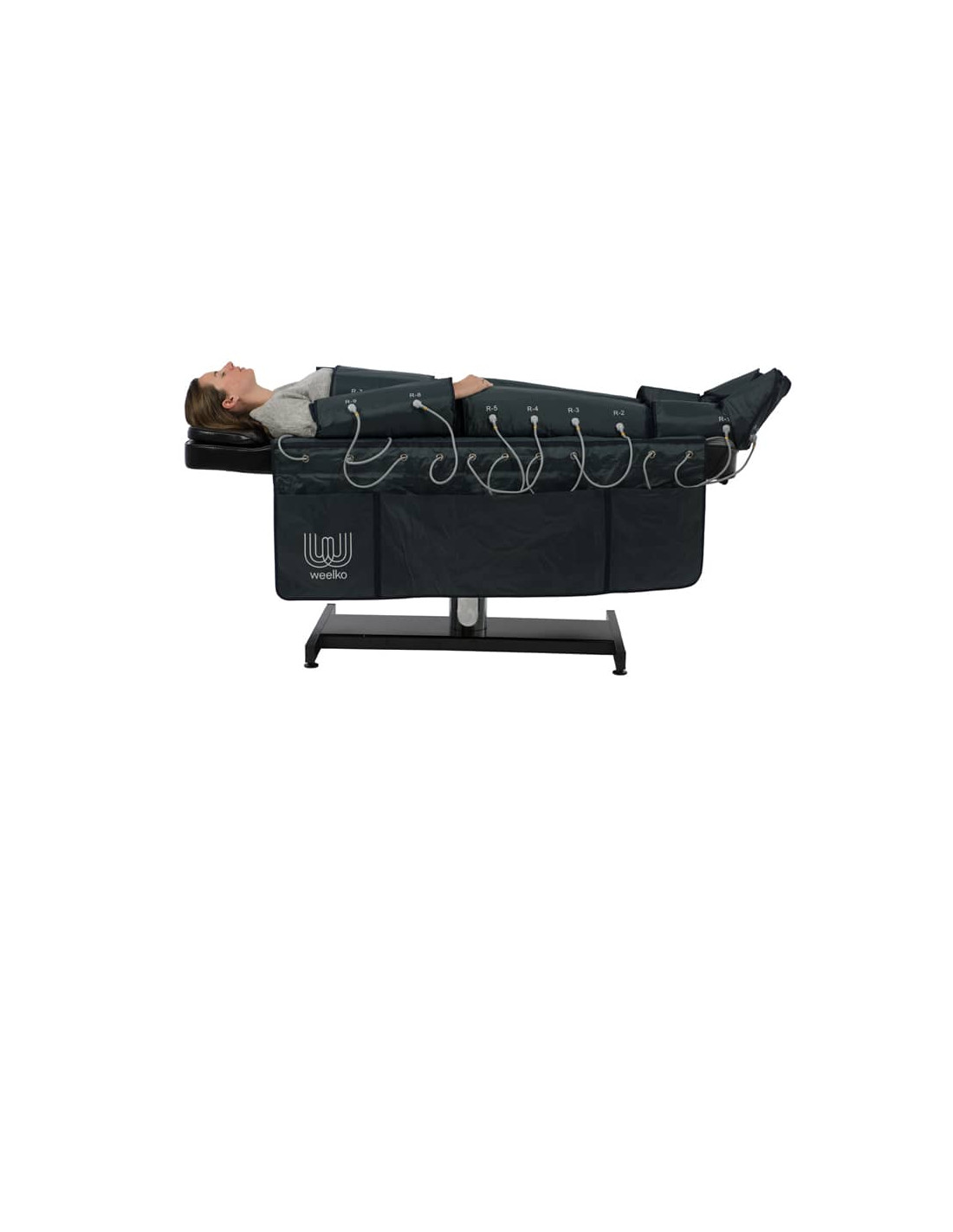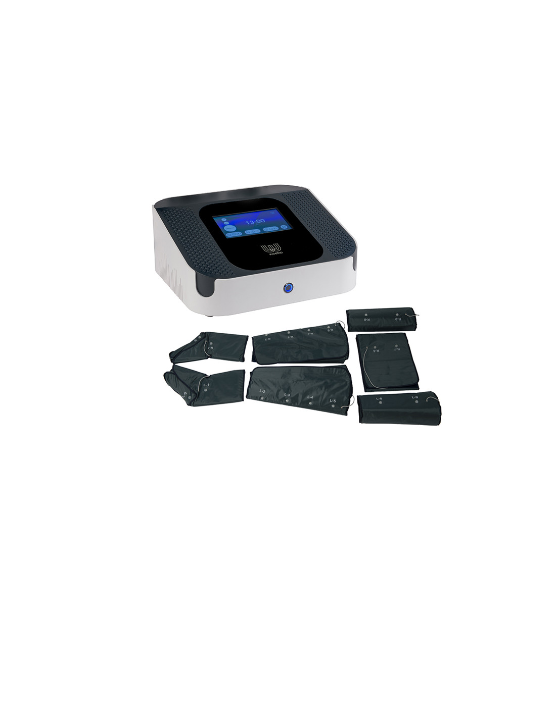 Aparato digital con pantalla táctil, combina doble función termoterapia y presoterapia. Traje compuesto de botines, faja para abdomen y brazos, con manta para almacenar los cables. Su uso mejora la circulación y facilita la eliminación de grasas, gracias al drenaje linfático, también revitaliza la oxigenación celular y la relajación muscular.