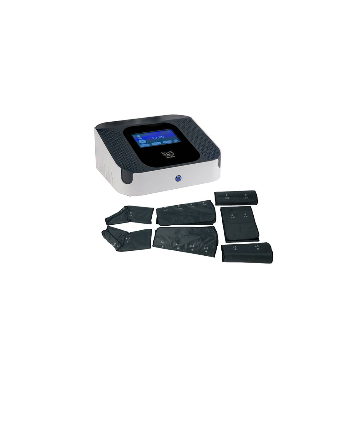 Aparato digital con pantalla táctil y 4 programas de trabajo. Traje compuesto de botines, faja para abdomen y brazos, con manta para almacenar los cables. Su uso mejora la circulación y facilita la eliminación de grasas, gracias al drenaje linfático, también revitaliza la oxigenación celular y la relajación muscular.