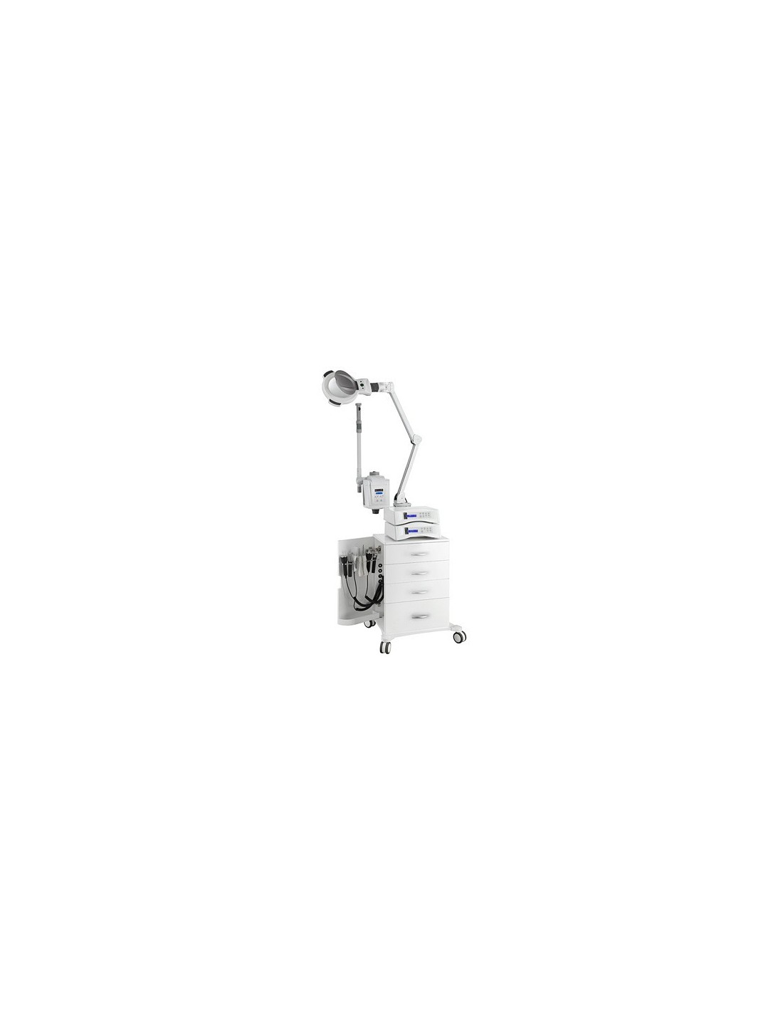 Torre multifunción de diseño moderno. Equipada de modo estándar con un carrito de madera lacado en blanco con 4 cajones y 2 puertas laterales pensadas para un práctico almacenaje de los accesorios de belleza, una lupa de 5 aumentos (1006T) y un vaporizador (F-300DT). La combinación se completa con dos equipos a escoger según sus necesidades (de la serie MultiEquipment), lo que permite combinar hasta 12 funciones diferentes. Plataforma con 4 ruedas para facilitar el desplazamiento de la unidad. Especialmente indicado para centros de belleza y estética.