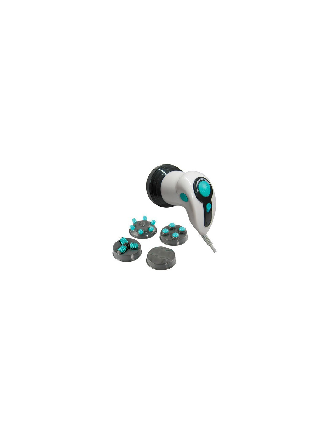 Instrumento de masaje portátil para tratamientos de prevención de la celulitis. Equipado con 4 cabezales intercambiables para distintos tipos de masaje y luz de infrarrojos. Intensidad ajustable.