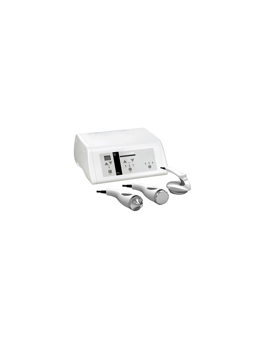 Instrumento de ultrasonidos con electrodo corporal, facial y orbicular. Los ultrasonidos emiten tres tipos de ondas, continua, pulsada y combinada, a escoger según el tratamiento a realizar.