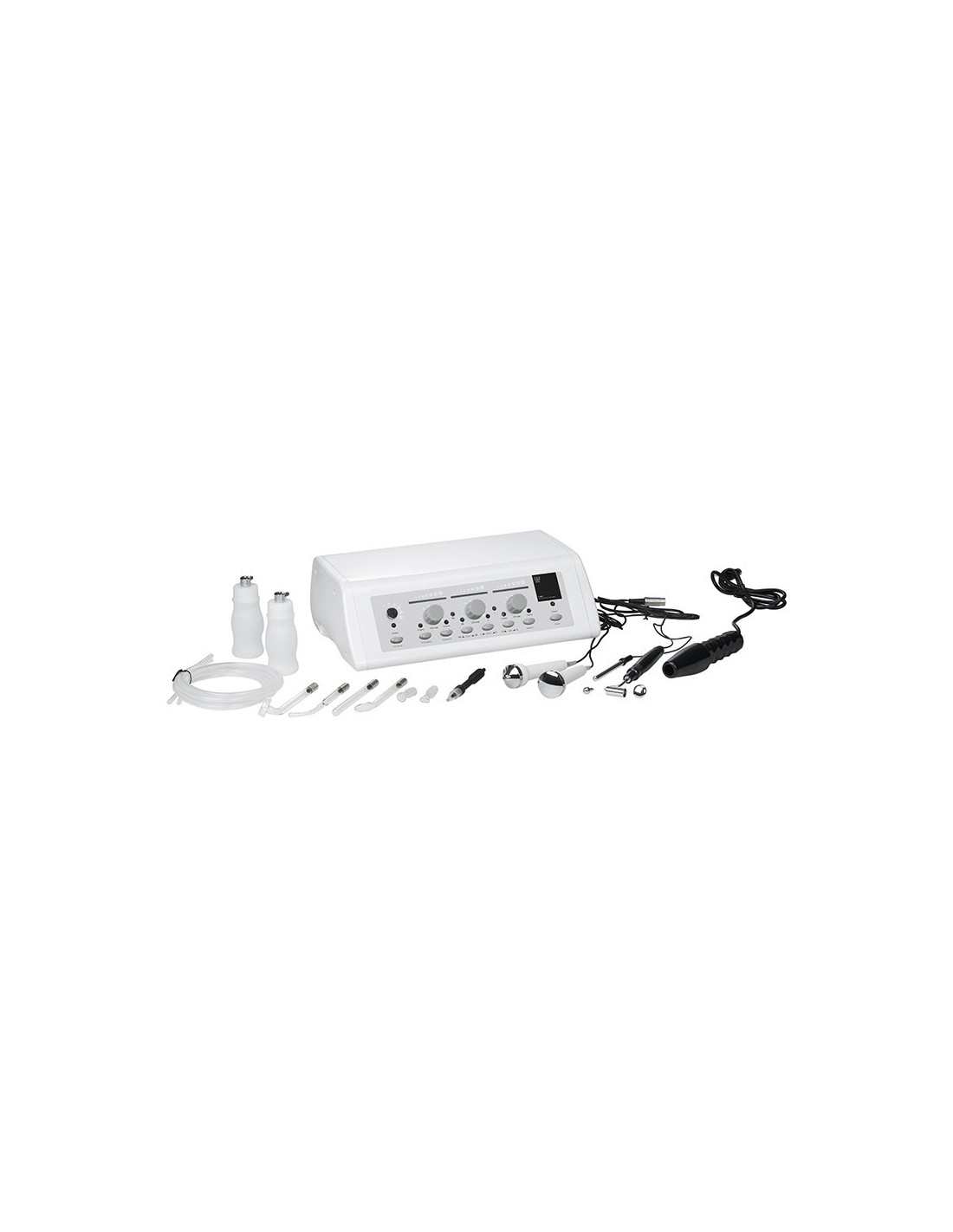 Completo instrumento que combina 5 funciones en un solo aparato: alta frecuencia, ultrasonidos, corriente galvánica y succión y pulverización.