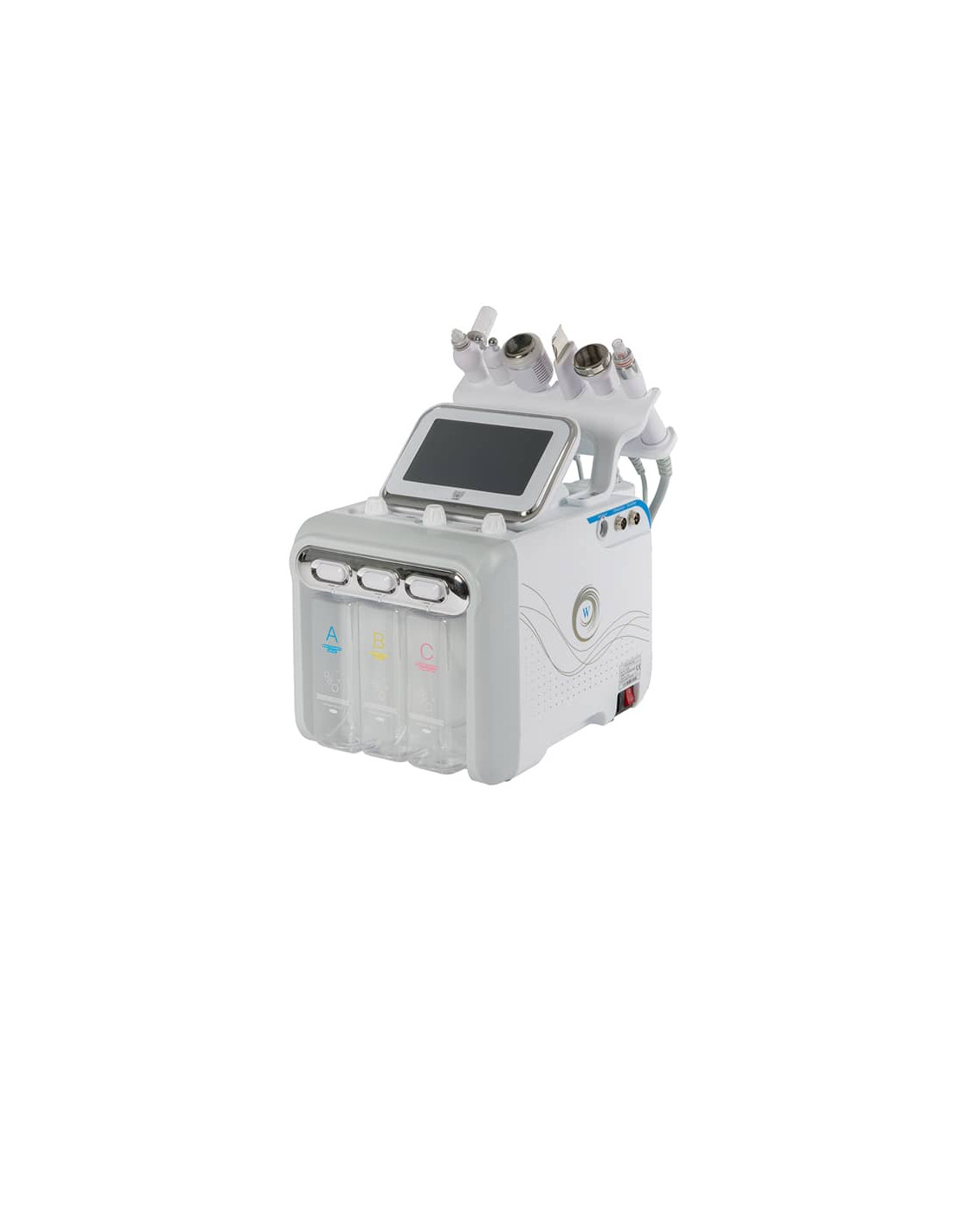 Modelo digital con pantalla táctil y 6 funciones, radiofrecuencia bipolar (onda contínua o pulsada), ultrasonido, espátula de exfoliación mediante ultrasonidos, spray, hidrodermoabrasión y martillo frío.