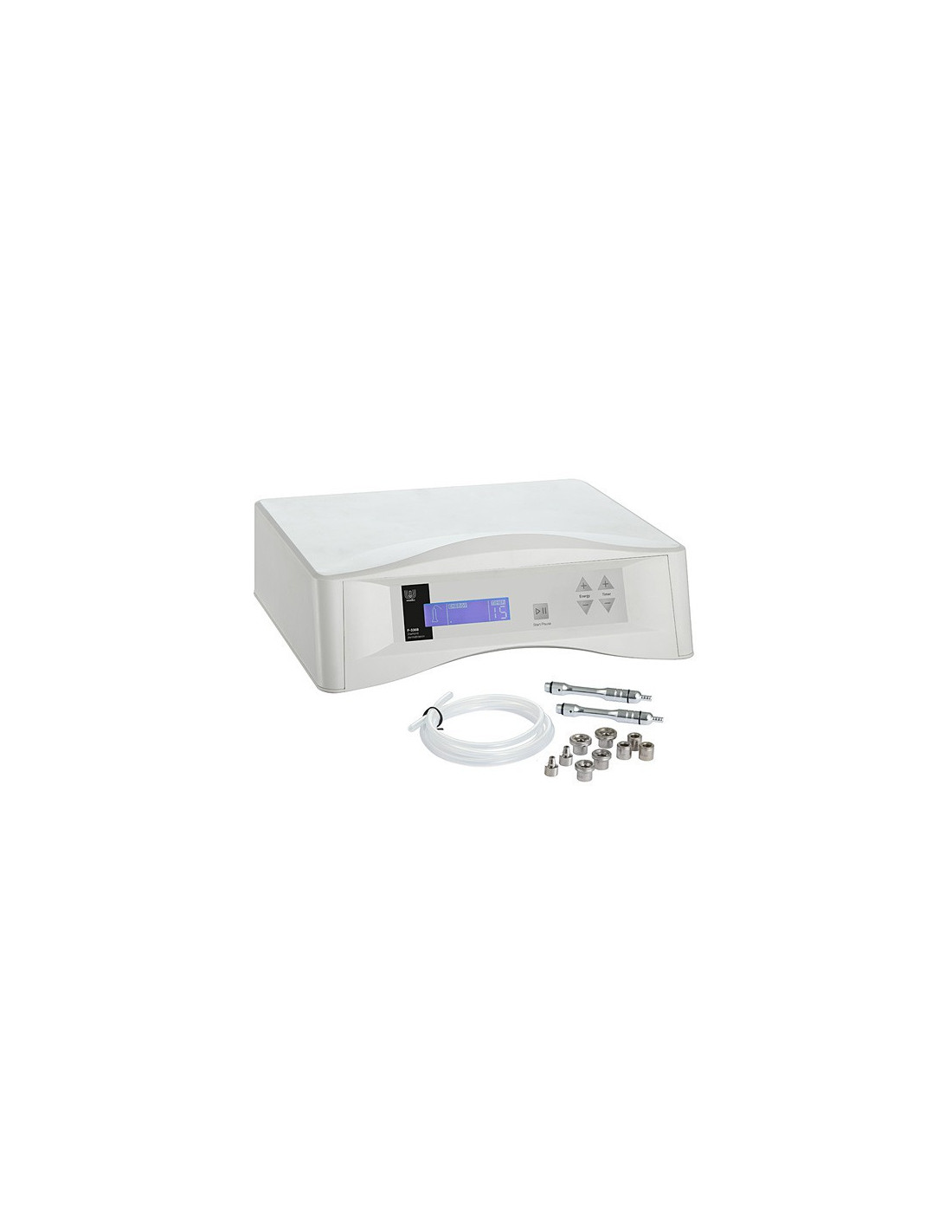 Instrumento de microdermoabrasión mediante puntas de diamante. Utilizado para tratamientos de exfoliación de la capa córnea de la piel. Equipado con 9 cabezales y 2 aplicadores con sistema de vacío para la succión de las células muertas.