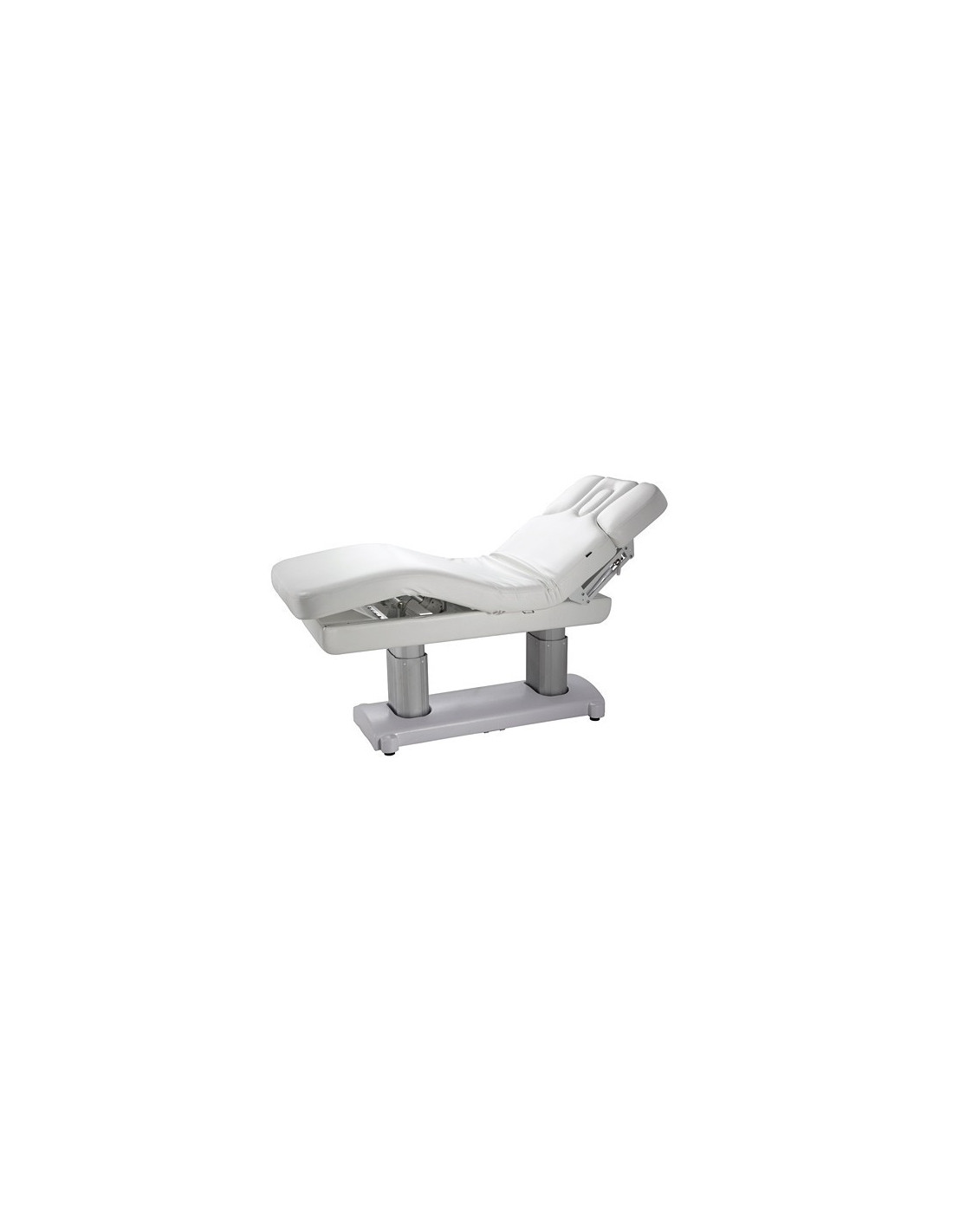 Equipada con 4 motores que regulan la altura y la inclinación del respaldo, del reposapiés y de toda la camilla. Acolchado de gran confort con tapizado PU blanco de gran calidad. Colchón de una única pieza con 3 secciones. Reposabrazos ajustables y cabezal con agujero facial. Carga máxima 200 kg.