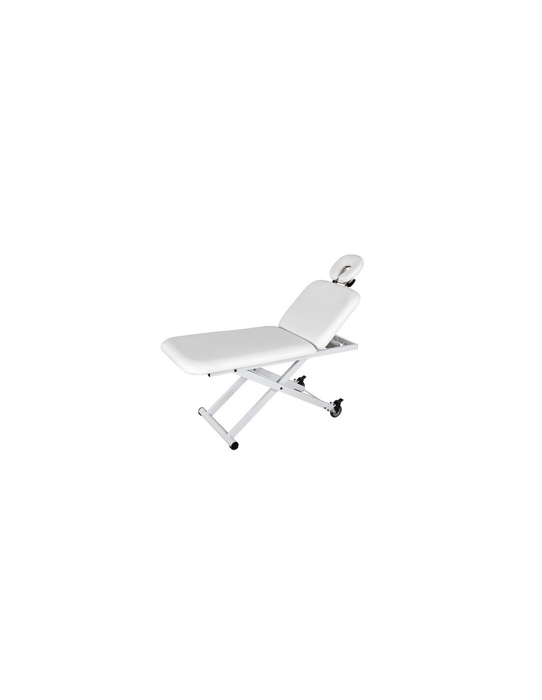 Camilla eléctrica de 2 cuerpos de gran estabilidad. Equipada con 1 motor que regula la altura mediante la botonera integrada en la estructura. Respaldo regulable mediante pistón de gas. Reposacabezas regulable y extraíble. Incluye 2 ruedas para desplazarla. Tapizado blanco en PU de gran calidad. Carga máxima 180 kg.