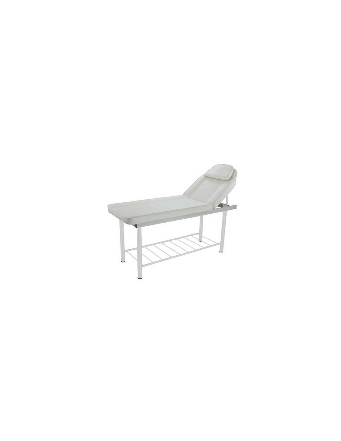 Camilla fija de 2 cuerpos con estructura metálica pintada en blanco. Inclinación del respaldo regulable manualmente. Cojín reposacabezas extraíble con agujero facial. Tapizado blanco en PVC de fácil limpieza. Carga máxima 150 kg.