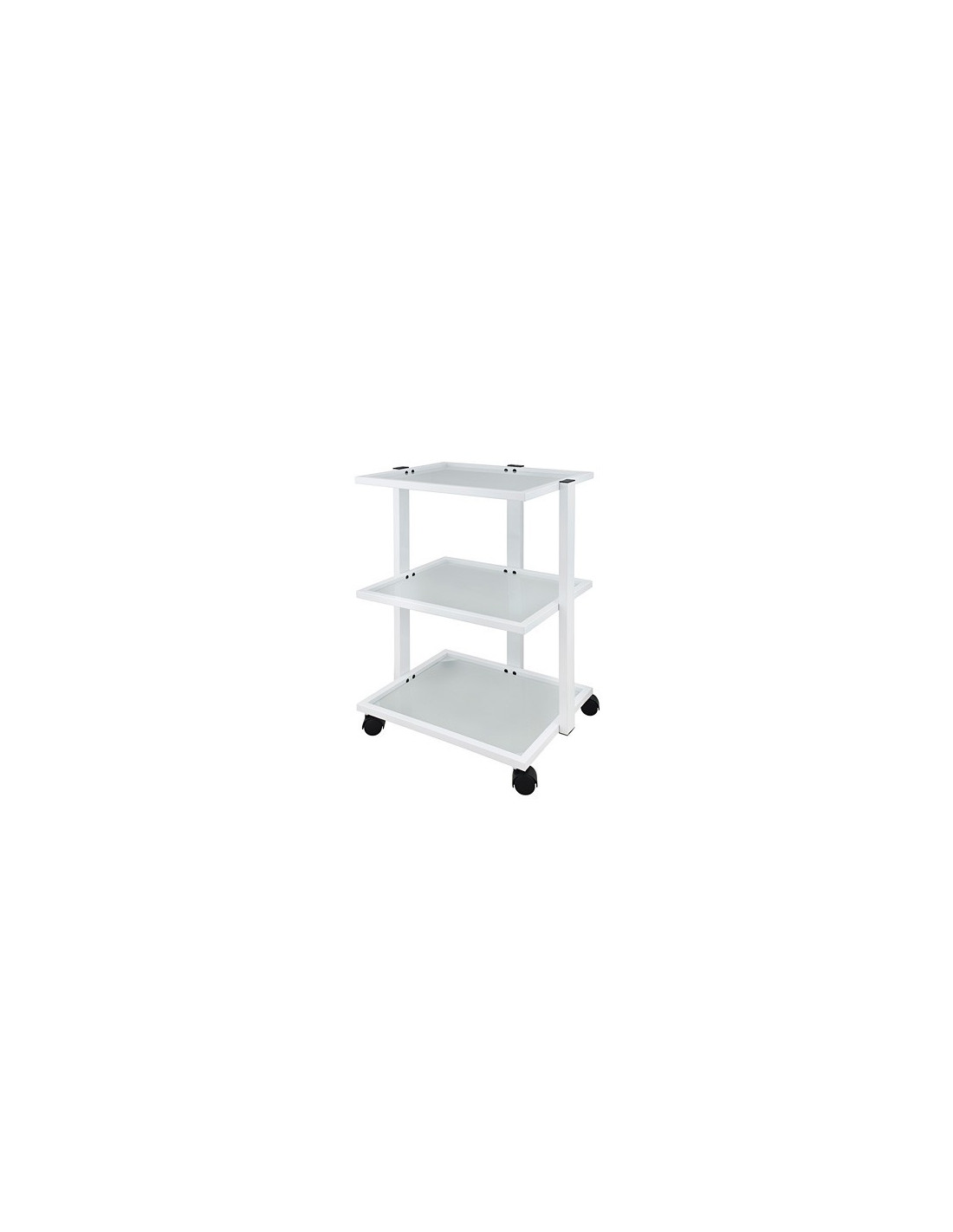 Carrito blanco de estructura metálica de diseño simple y práctico. Equipado con 3 amplios estantes de cristal translúcido para la colocación de instrumentos de trabajo. Total movilidad gracias a sus 4 ruedas.