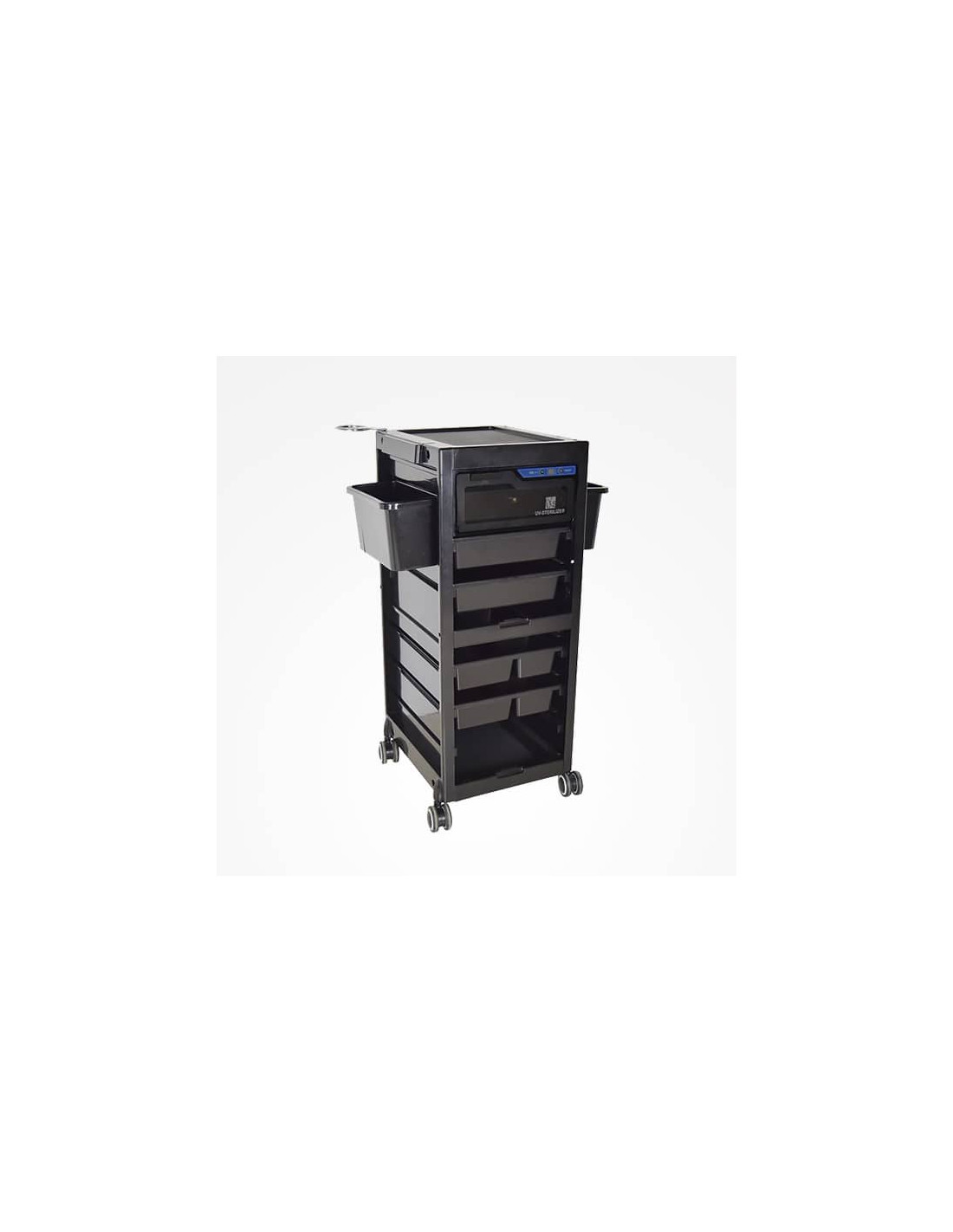Funcional carro provisto de 4 bandejas extraíbles y cajón esterilizador. Bandeja superior con aro para el secador, 2 compartimentos móviles. Estructura de plástico reforzado. Adecuado para desinfectar diariamente los utensilios.