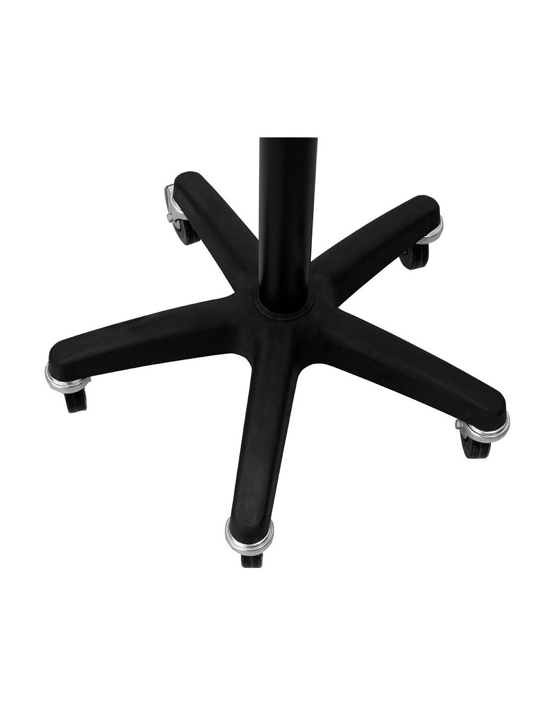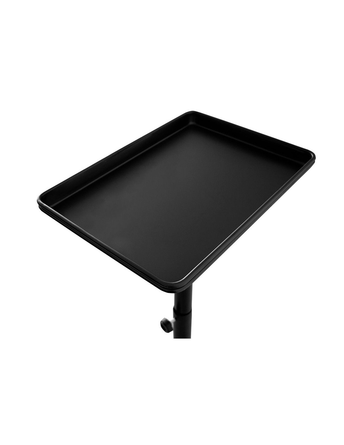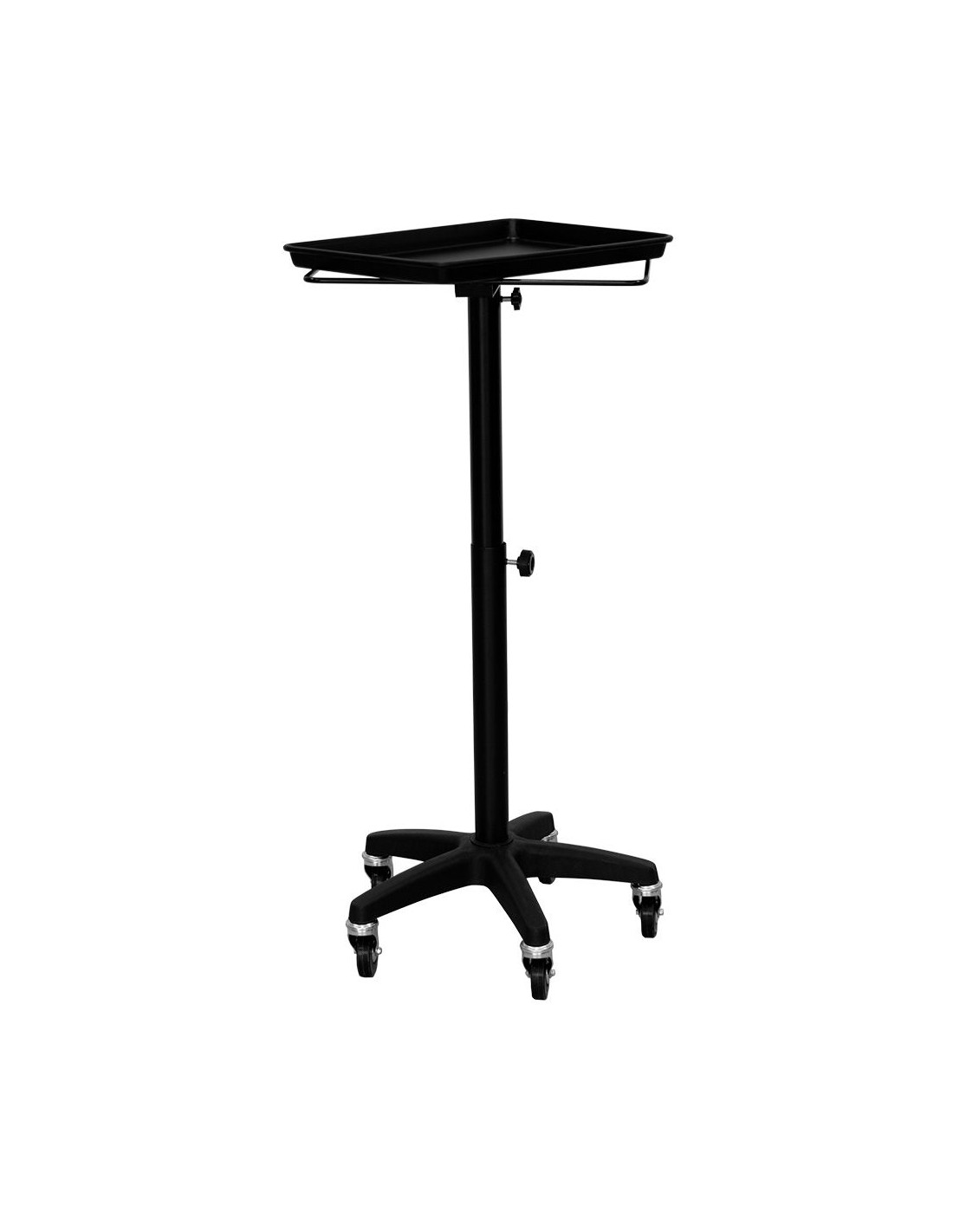 Carrito auxiliar para tintes con bandeja extraíble de aluminio. Poste de metal regulable en altura. Base de estrella con 5 ruedas para facilitar el desplazamiento.