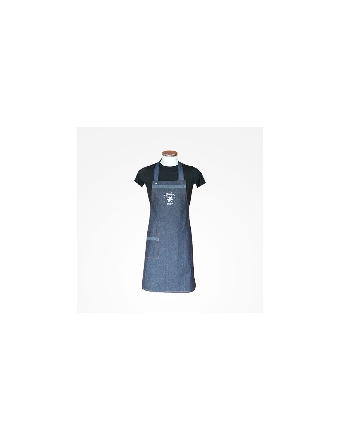 Confeccionado en tela azul vaquero 100 % algodón. Talla única ajustable a lo largo y ancho. Práctico bolsillo lateral.