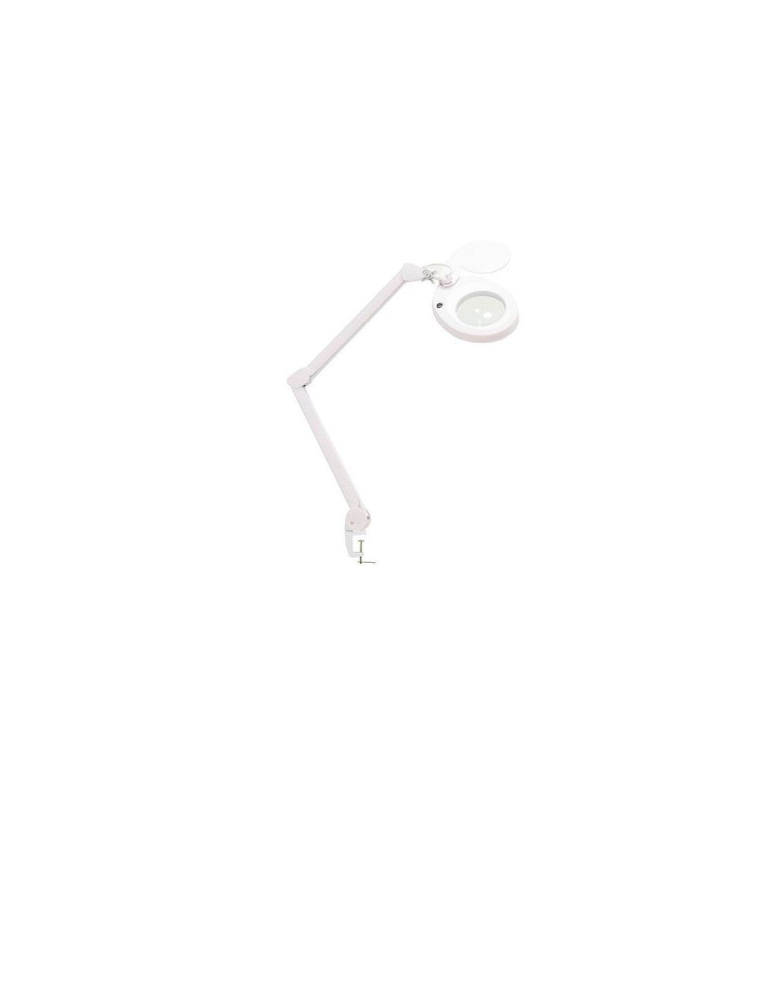 Lupa de 5 aumentos y luz fría, vida útil de 20.000 h. Dispone de pieza para acoplar a mesas o carros de estética. Cabezal regulable y tapa protectora de la lente. 45 Leds con un flujo luminoso de 610 lumen y una vida útil de 20000 h.