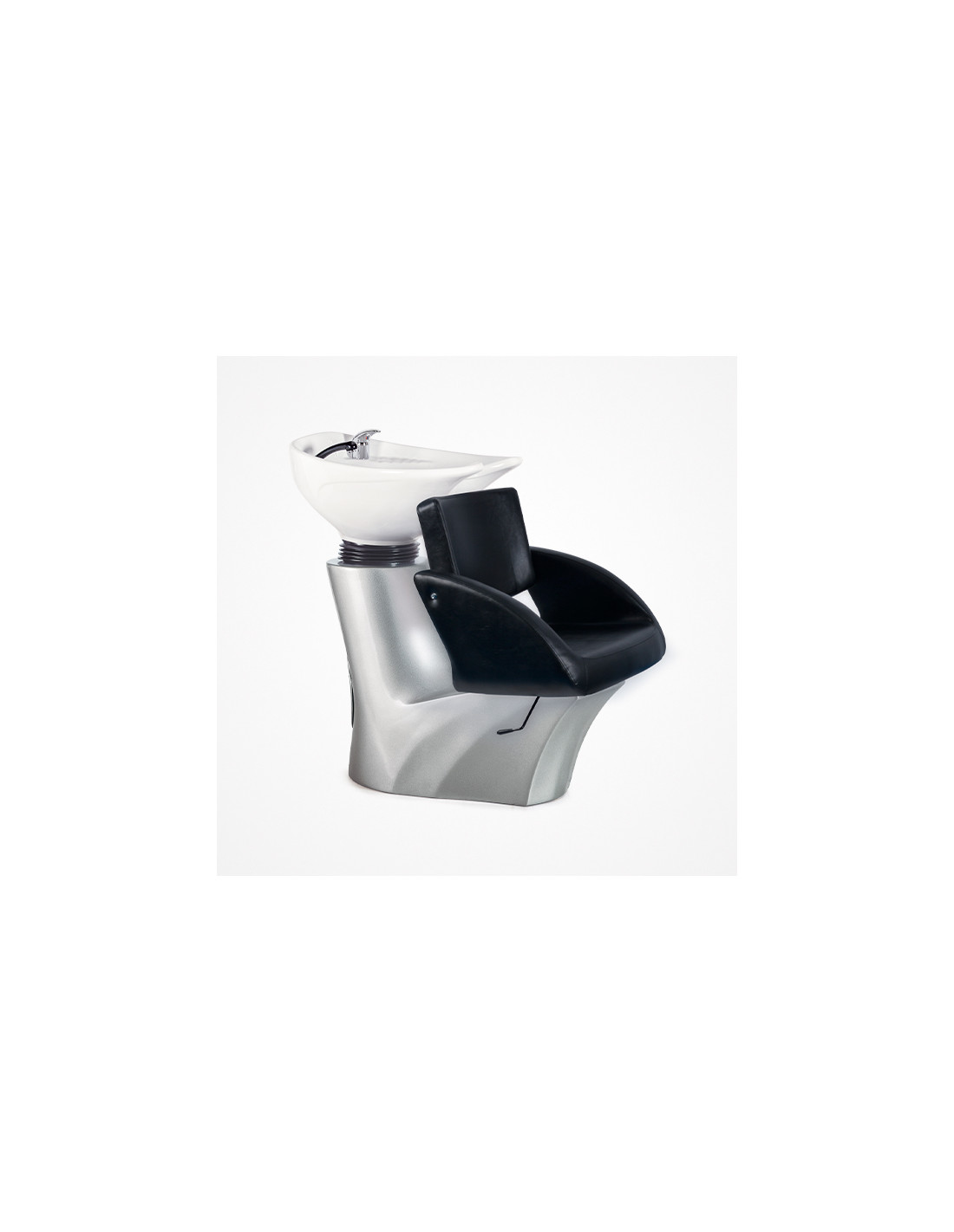 Lavacabezas Neil con poza blanca reclinable de cerámica y grifos monomando italianos. Más sillón Sirius tapizado en negro con asiento deslizante y respaldo reclinable. Garantiza un diseño elegante, un mantenimiento simple y una comodidad sublime.