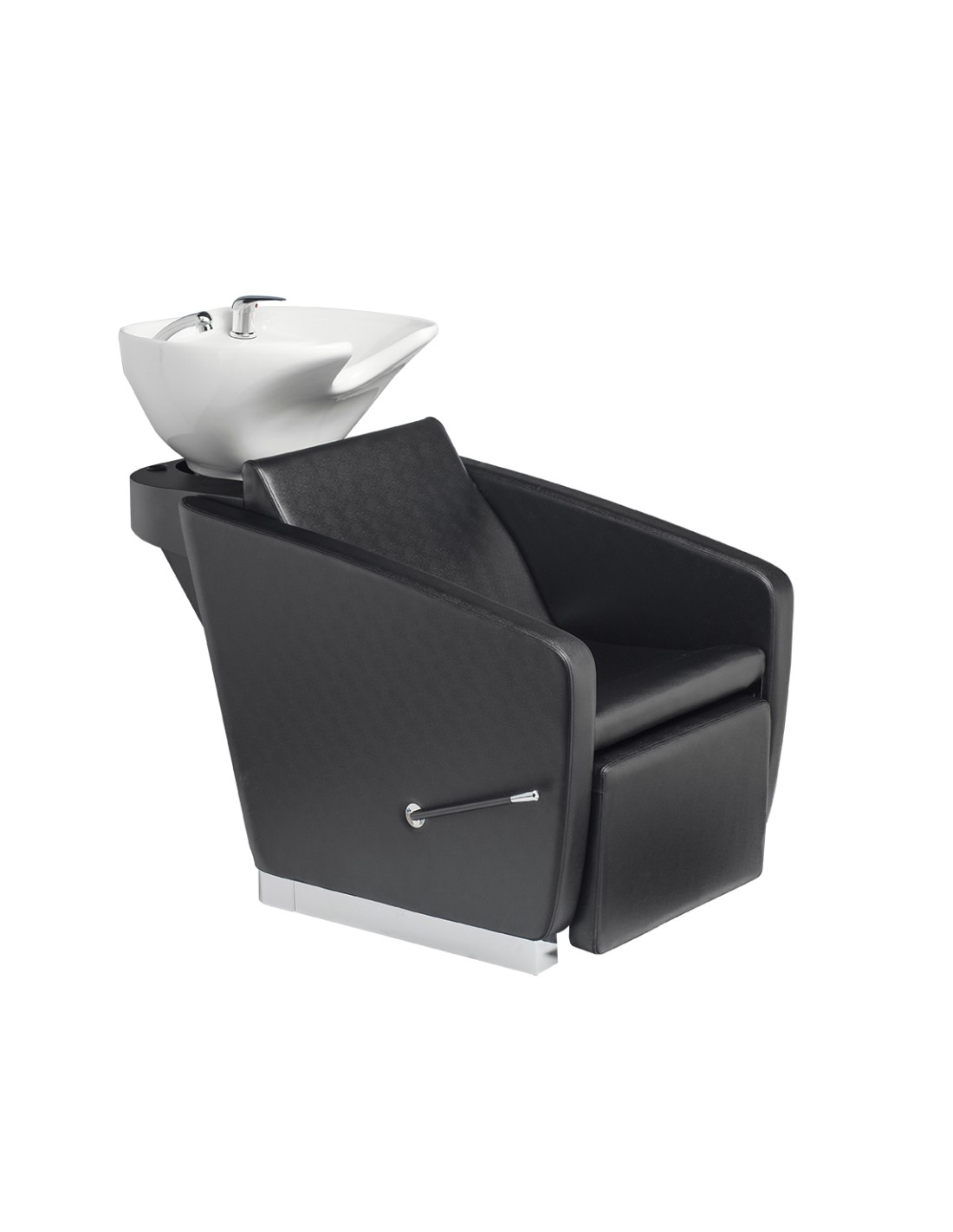 Tapicería de gran durabilidad en color negro, apoyapiés manual y poza de cerámica basculante color blanco de gran capacidad. Grifo monomando hidromezclador.