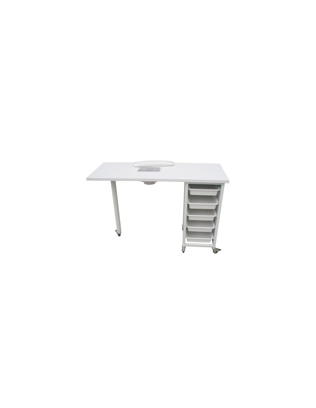 Mesa portátil equipada con 5 cajones de almacenaje extraíbles y aspirador con cojín reposamanos. Prácticas ruedas con sistema de bloqueo y pie lacado.