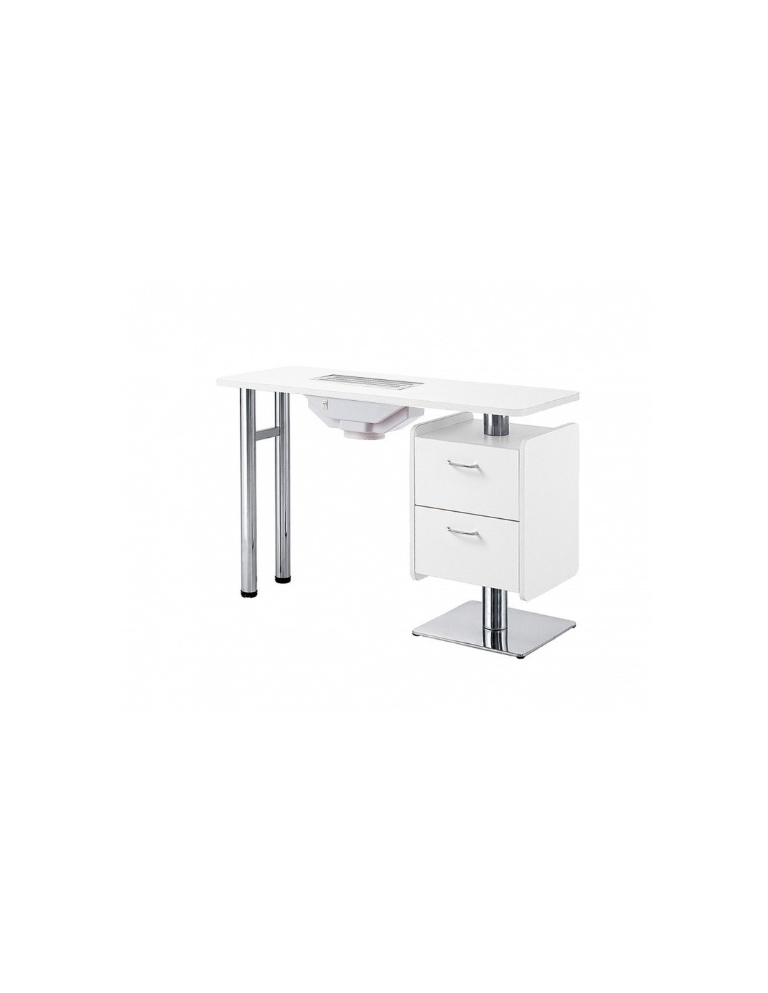 Elegante mesa de manicura de madera contrachapada en blanco con aspirador, bolsa y cojín reposamanos. Pies cromados y columna de almacenaje con dos cajones.
