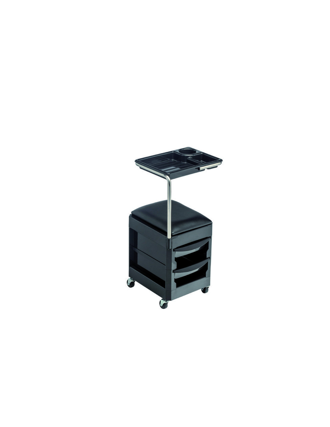 Disponible en color negro. Con dos bandejas extraíbles y cajón bajo del asiento. Con ruedas antipelos para un mayor desplazamiento. Con bandeja porta utensilios para facilitar el trabajo de manicura.