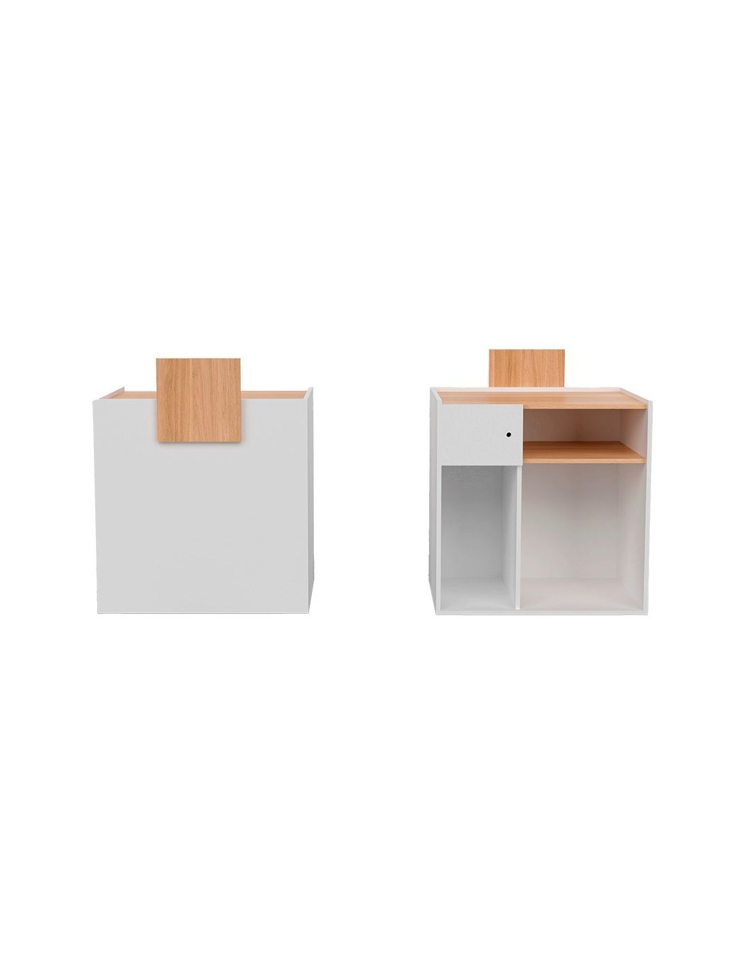 Mueble de recepción para peluquerías o barberías. La estructura del mueble está fabricada con tablero aglomerado de alta densidad, acabado con lámina de melamina de color blanco y con cantos de PVC aplacados con cola de poliuretano para un perfecto sellado. Tablero superior y frontal elevado decorativo efecto roble. Interiores diseñados para maximizar el espacio de almacenamiento de manera inteligente