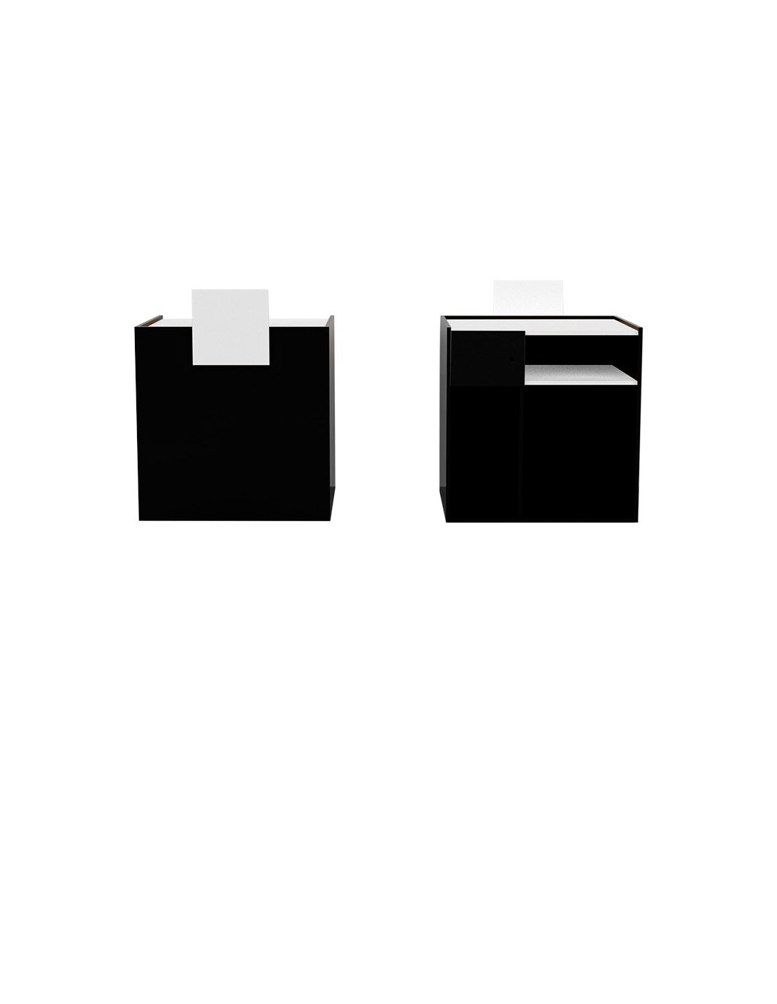 Mueble de recepción para peluquerías o barberías. La estructura del mueble está fabricada con tablero aglomerado de alta densidad, acabado con lámina de melamina de color negro y con cantos de PVC aplacados con cola de poliuretano para un perfecto sellado. Tablero superior y frontal elevado decorativo en color blanco. Interiores diseñados para maximizar el espacio de almacenamiento de manera inteligente