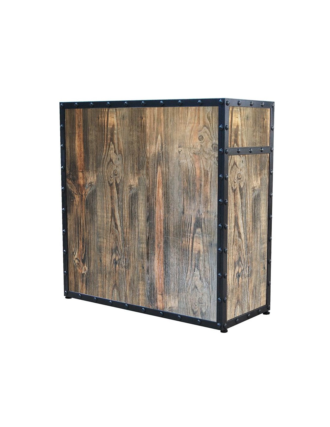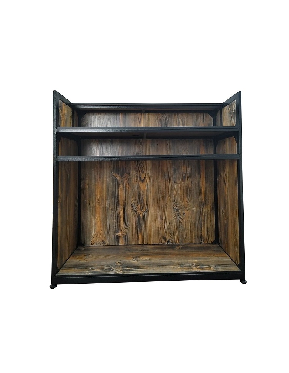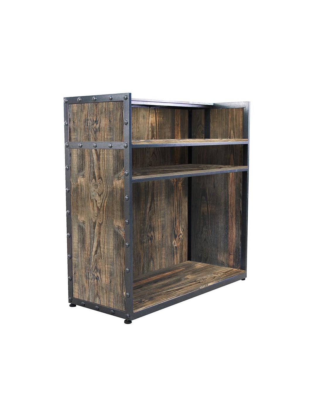 Recepción para salones de peluquería y de barbería. Fabricada con paneles de madera contra chapada, recubiertos de melamina con acabado madera rústica. Armazón metálico de color negro con remaches metálicos.