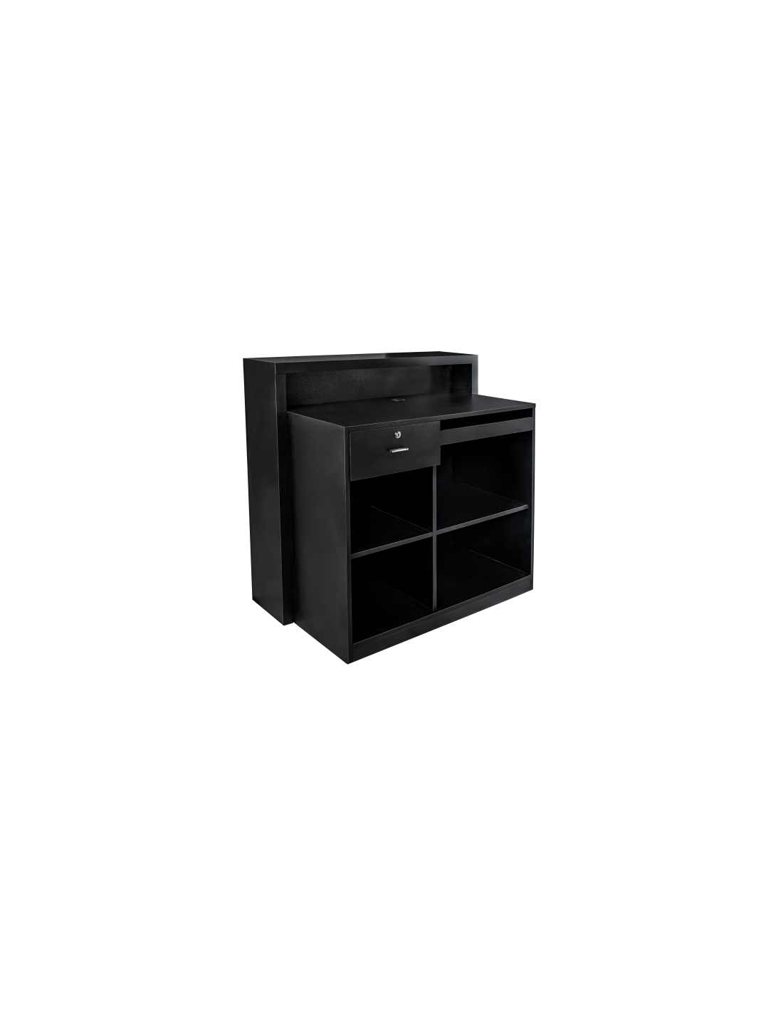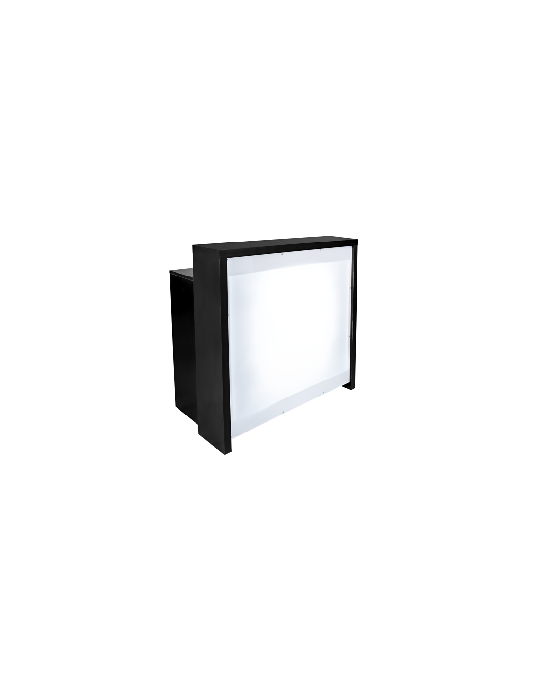 Estructura de madera en color blanco o negro. Frontal de metacrilato retroiluminado, aportando calidez a la estancia. Gran capacidad de almacenaje con varias baldas, bandeja para el teclado.