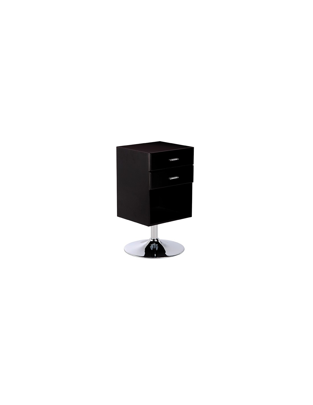 Fabricada en madera en color negro. Dispone de dos cajones y hueco inferior. Base cromada en forma de disco.