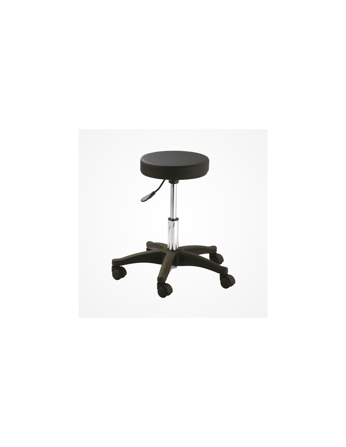Base de plástico con 5 ruedas. Altura ajustable con bomba de gas. Asiento plano de 30 cm de diámetro.