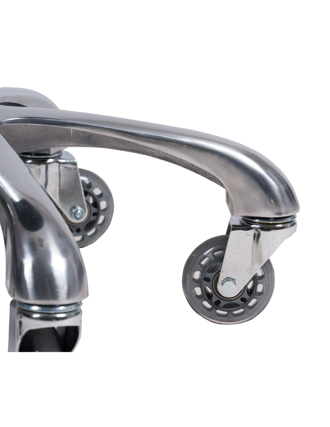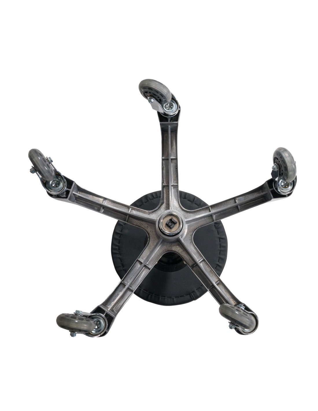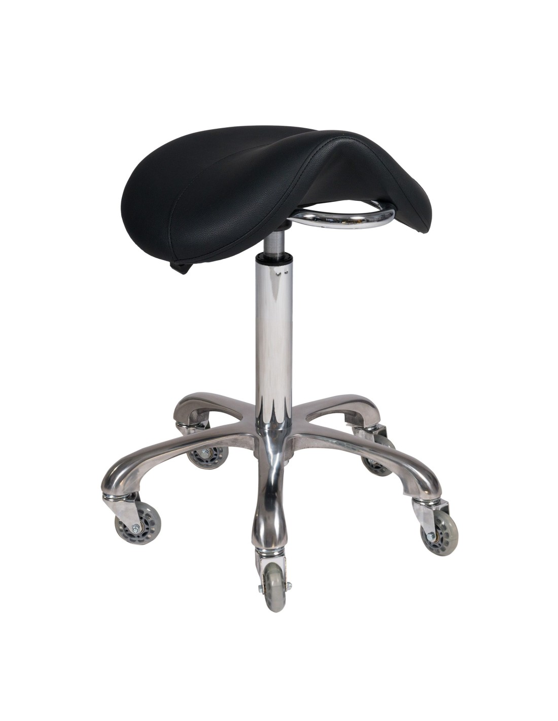 Taburete con asiento en forma de silla de montar con altura regulable mediante pistón de gas. Tapizado negro en PU de alta calidad. Base de inyección de aluminio con 5 ruedas de silicona con doble cojinete. Dispone de asa de acero inoxidable.