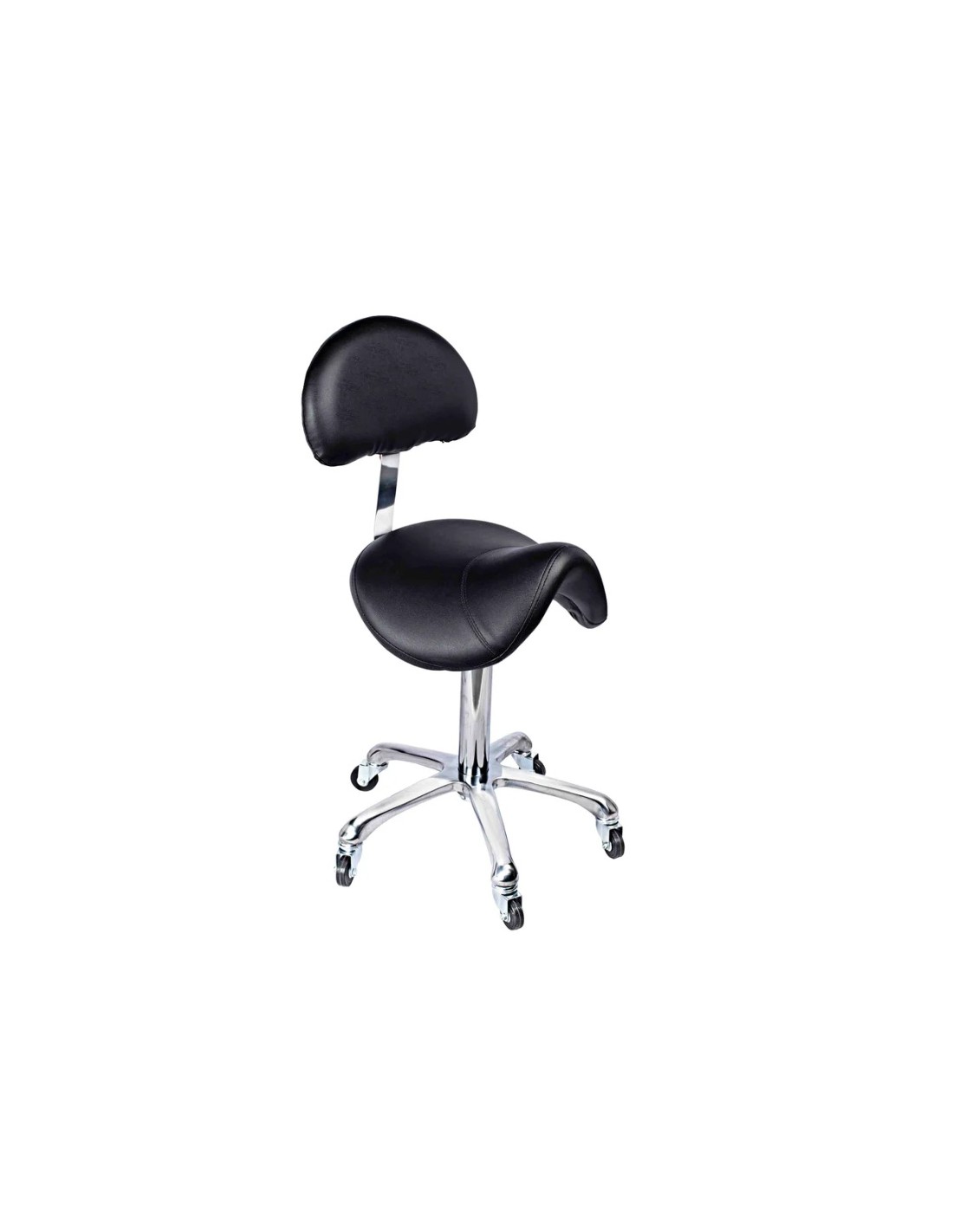 Tapizado en color negro. Diseño ergonómico. Base equipada con ruedas para su desplazamiento. Asiento en forma de silla de montar.