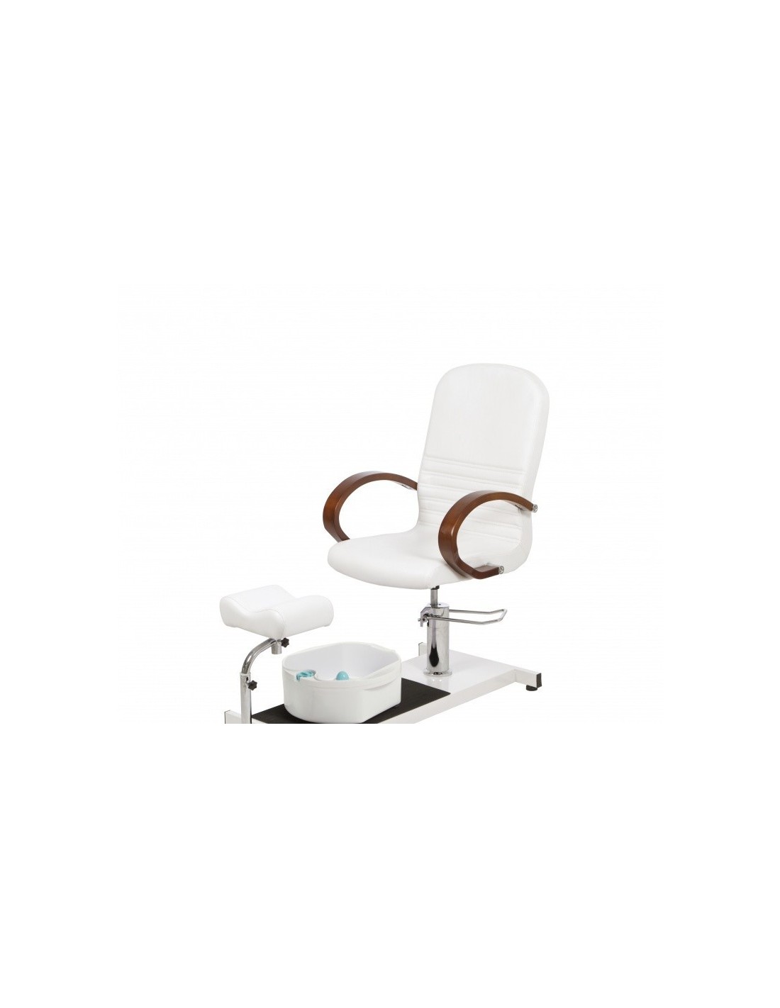 Sillón de podología con bañera de pies y reposapiés giratorio ajustable en altura. Altura y rotación del sillón regulable con bomba hidráulica y sistema de bloqueo. Reposabrazos con acabado de madera de color wenge. Incluye una alfombrilla antideslizante. Tapizado blanco en PVC de fácil limpieza. Capacidad de la bañera 10 l. Carga máxima 150 kg.