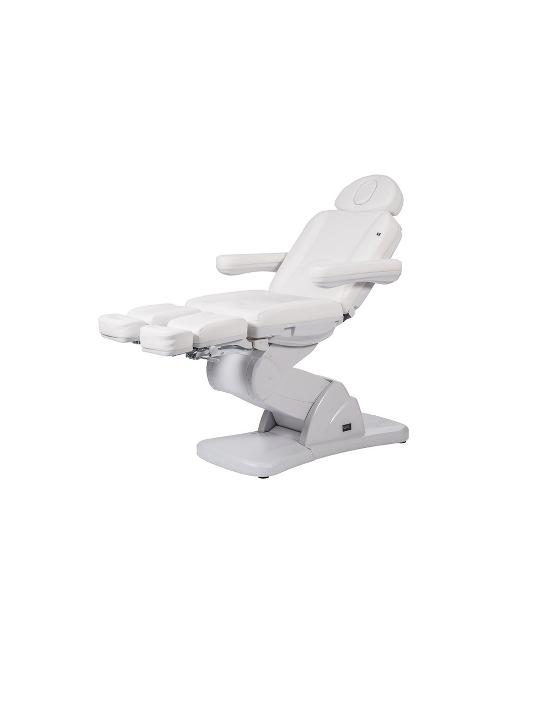 Dispone de 3 motores para controlar la altura y la inclinación del respaldo y asiento. Apoyabrazos abatibles y reposacabezas regulable con orificio facial. Apoyapiernas independientes y regulables con pistón de gas. Botones de mando integrados en respaldo y asiento para controlar desde cualquier punto de la camilla. Tapizado en PU resistente. Carga máxima 175 kg.