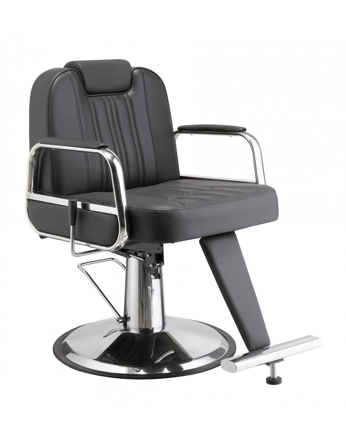 Reposacabezas extensible hasta 20 cm. Respaldo reclinable manualmente. Reposapiés metálico. Base cromada equipada con bomba hidráulica con freno. Tapizado de PVC con espuma de alta densidad. Brazos cromados. Carga máxima 150 kg.