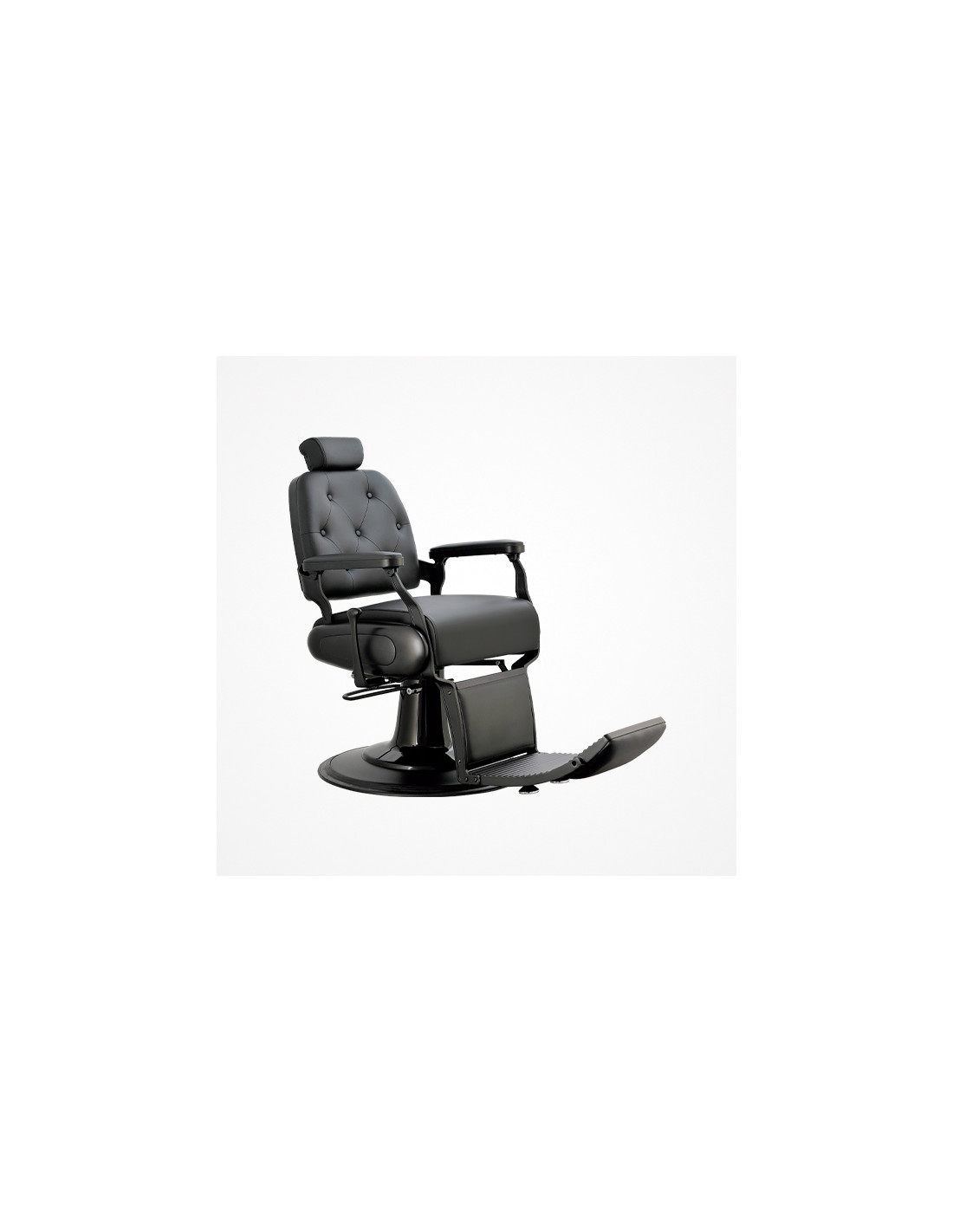 Sillón de barbero tapizado serie Negro NG3 con capitoné en el respaldo. Reposacabezas ajustable en altura, respaldo reclinable, reposapiés abatible y giro 360°. Estructura negra y bomba hidráulica con freno. Diseño elegante y clásico. Se puede retapizar.