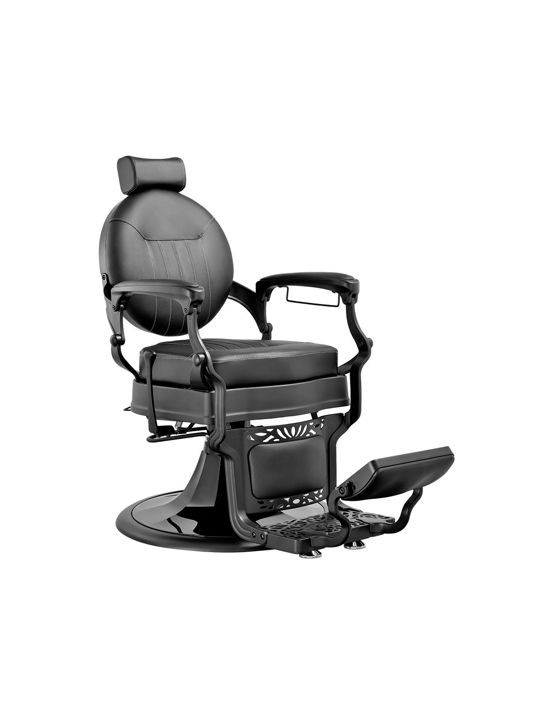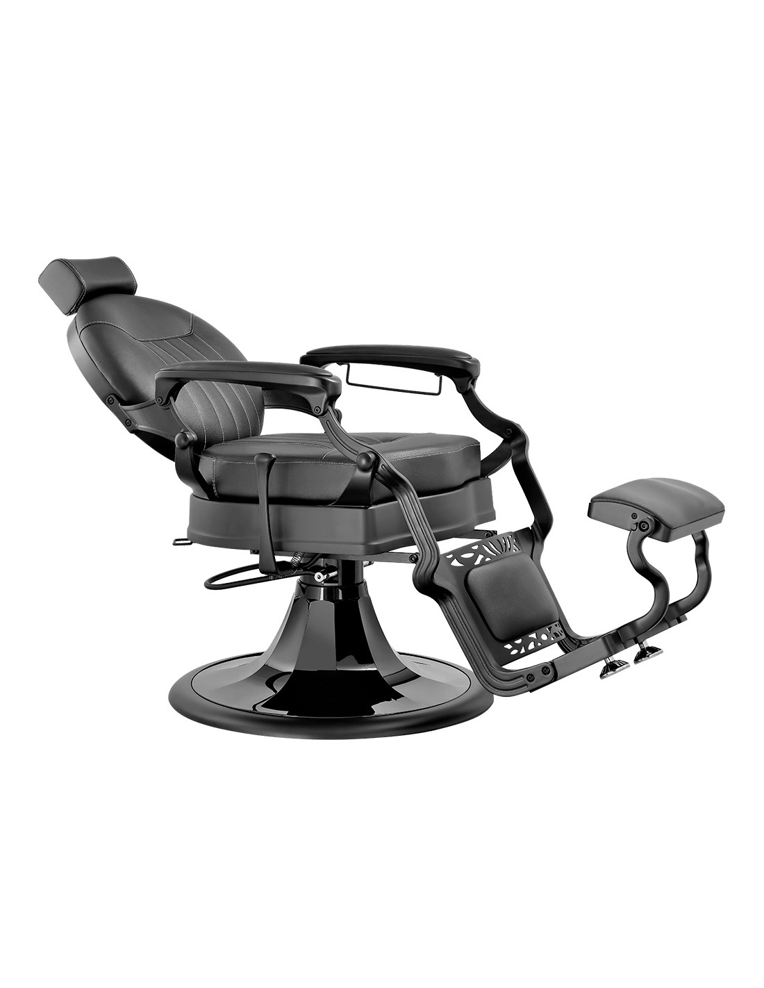 Sillón de barbería elegante, con un chasis completo metálico de inyección de aluminio. Base redonda y estructura completa con acabado cromado oscuro. Reposapiés reversible. Bomba hidráulica de alta calidad. Asiento con espuma de alta densidad para el máximo confort y durabilidad. Tapizado con acabado negro.