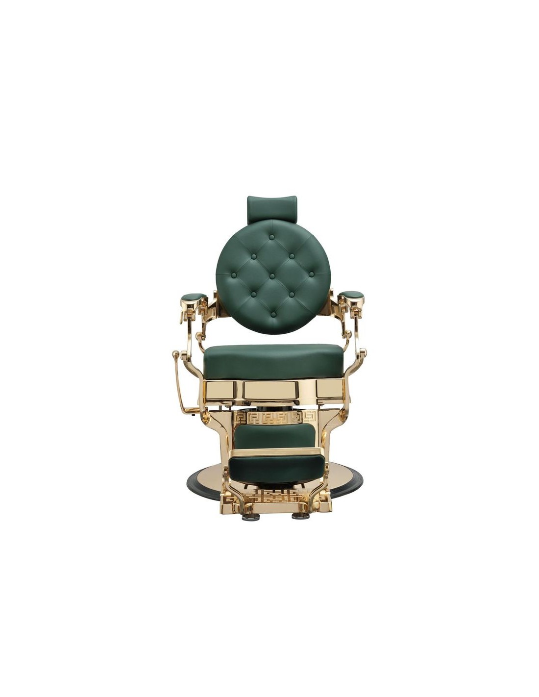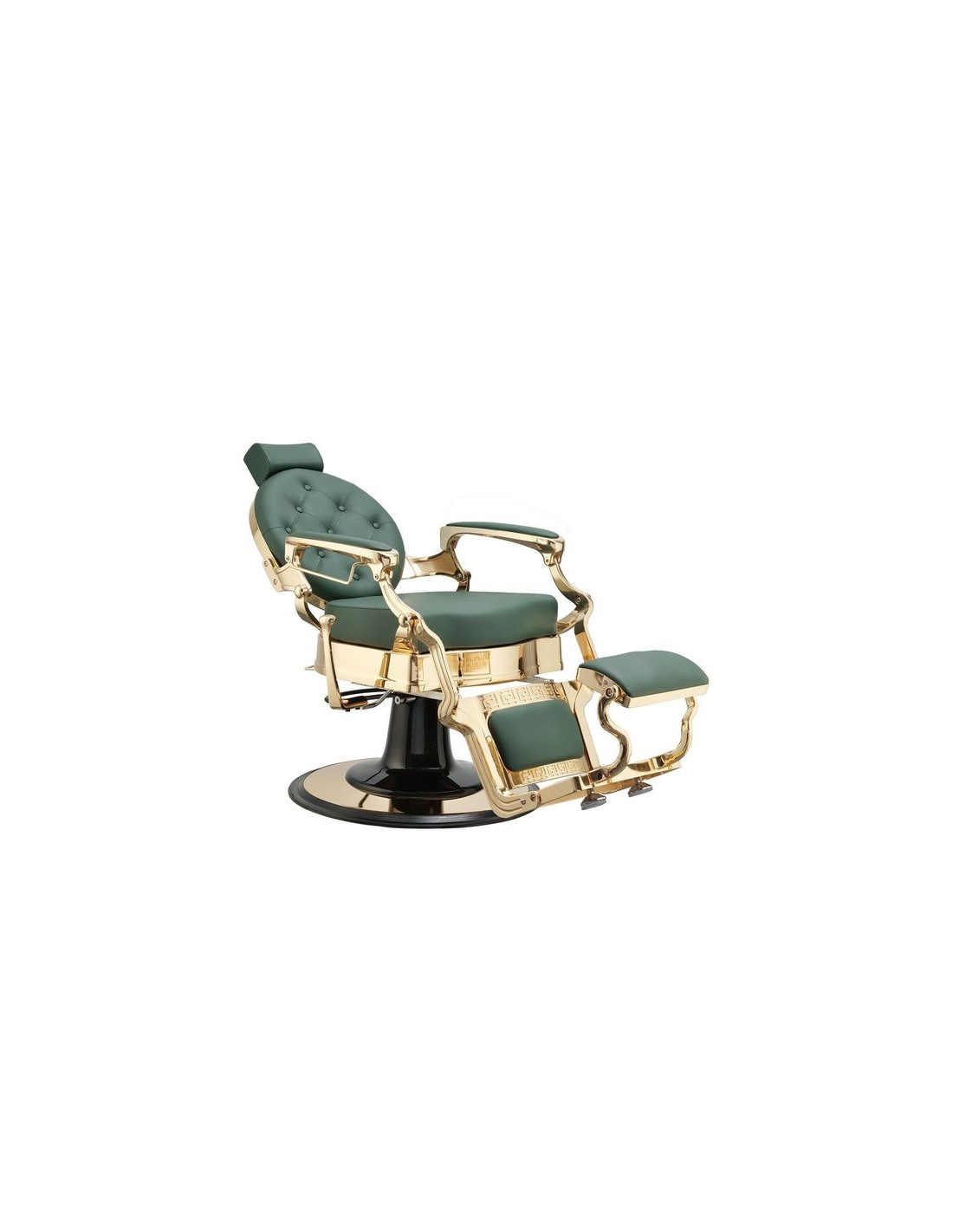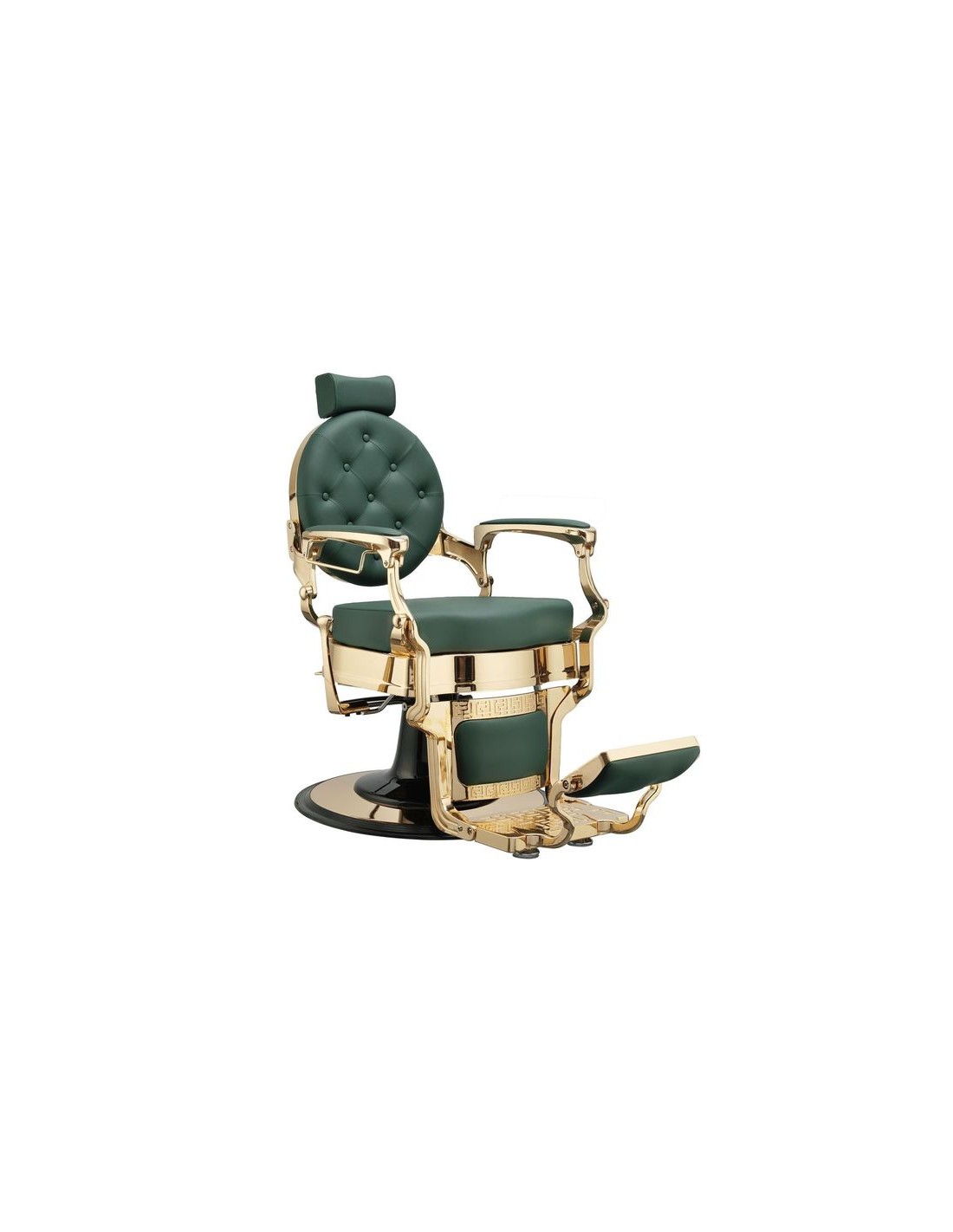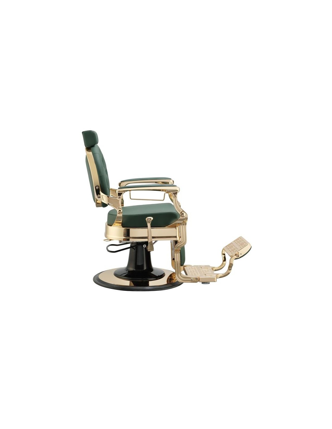 Sillón de barbería sofisticado, con un chasis completo metálico de inyección de aluminio. Base redonda y estructura completa con acabado cromado oro. Reposapiés reversible. Bomba hidráulica de alta calidad. Asiento con espuma de alta densidad para el máximo confort y durabilidad. Tapizado con acabado verde oscuro.