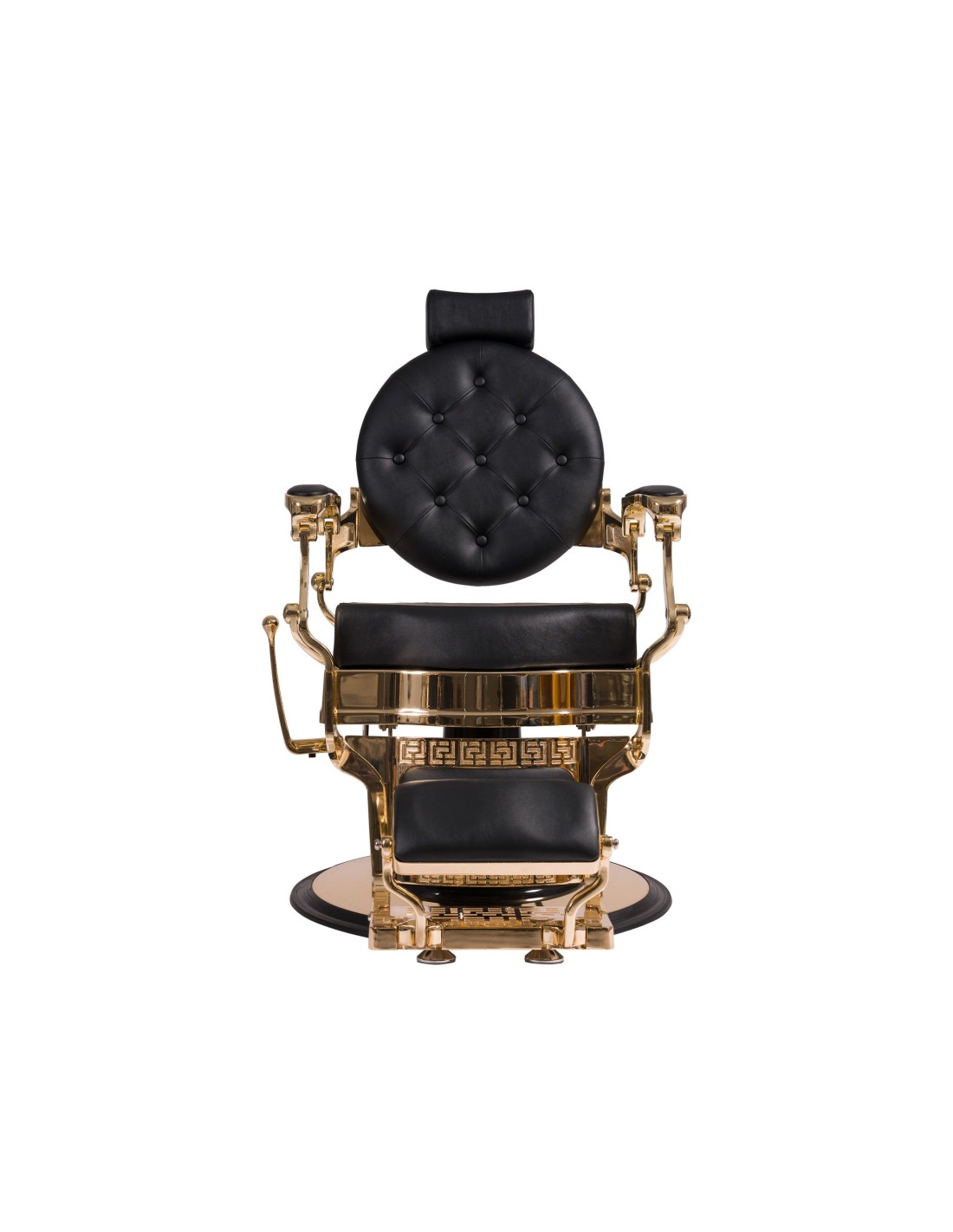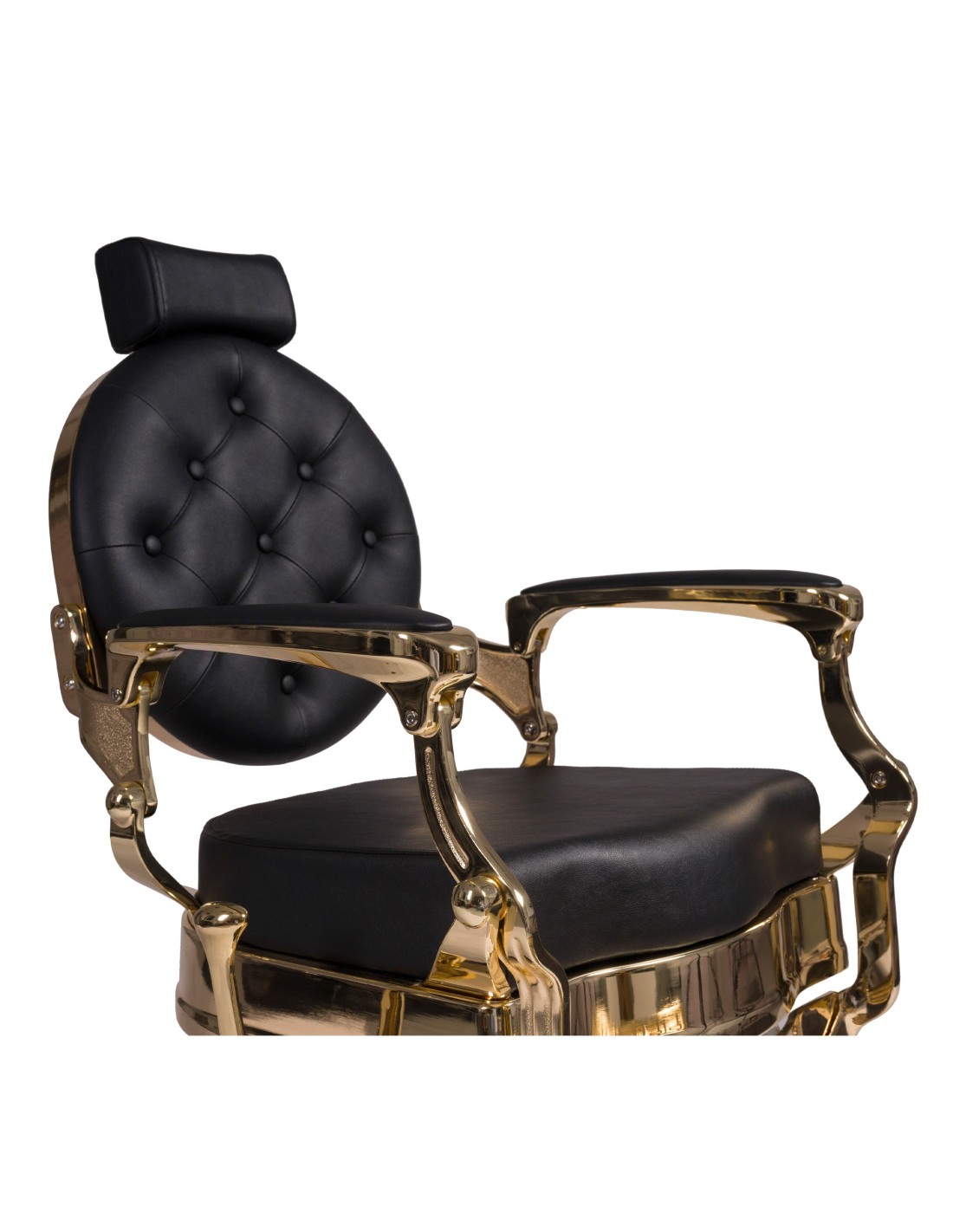 Sillón de barbería sofisticado, con un chasis completo metálico de inyección de aluminio. Base redonda y estructura completa con acabado cromado oro. Reposapiés reversible. Bomba hidráulica de alta calidad. Asiento con espuma de alta densidad para el máximo confort y durabilidad. Tapizado con acabado negro
