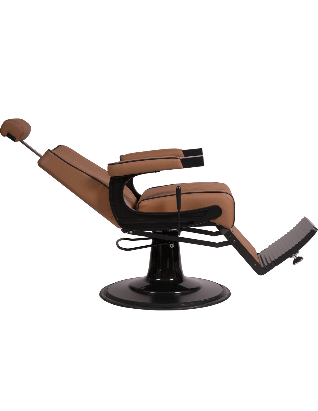 Sillón de barbería robusto, con un chasis a partir de piezas de inyección de aluminio acabado negro mate y estructura interior metálica. Base redonda con acabado negro mate y bomba hidráulica de alta gama. Asiento de espuma de alta densidad con muelles para el máximo confort y durabilidad. Tapizado color camel con costuras verticales y ribetes negros