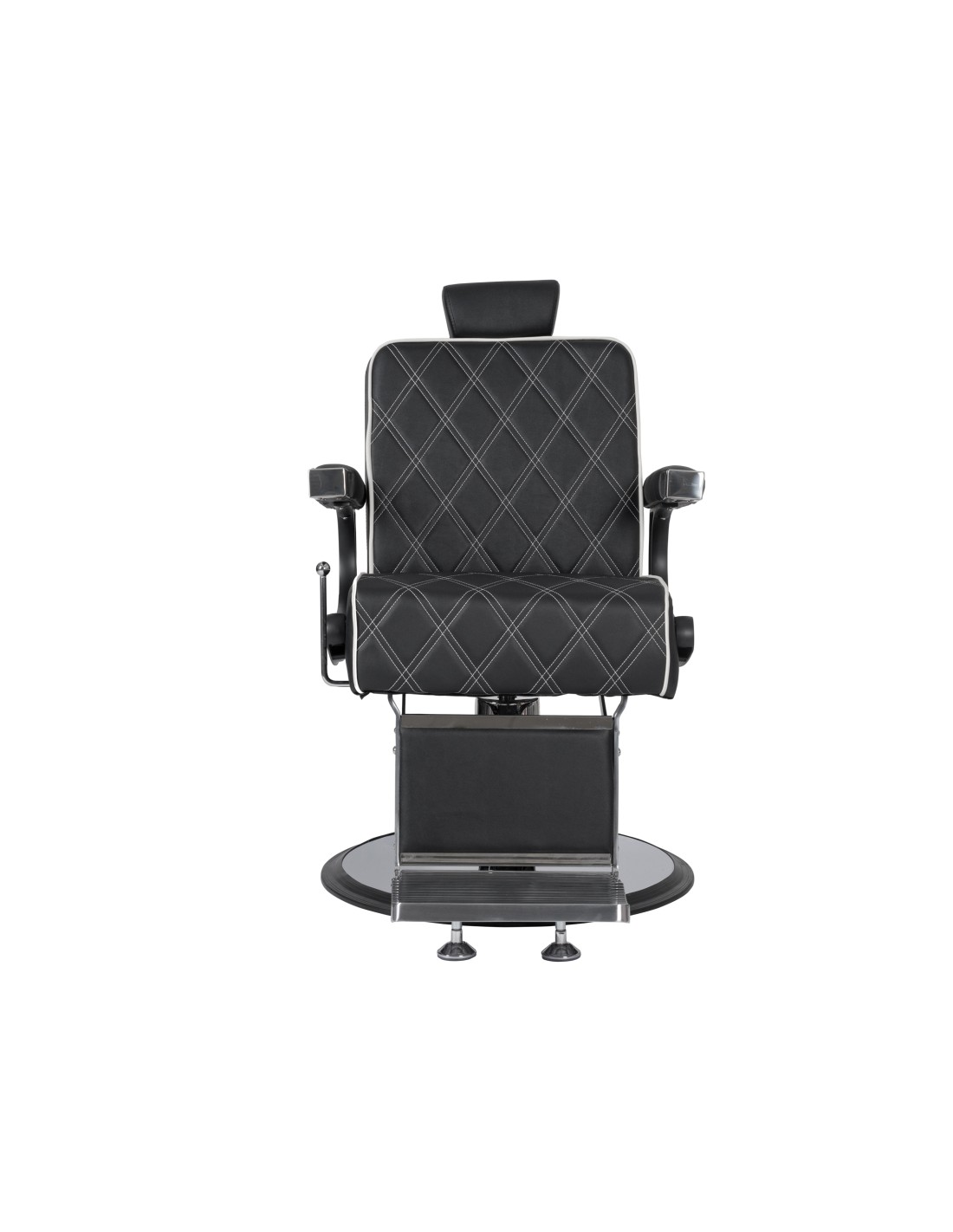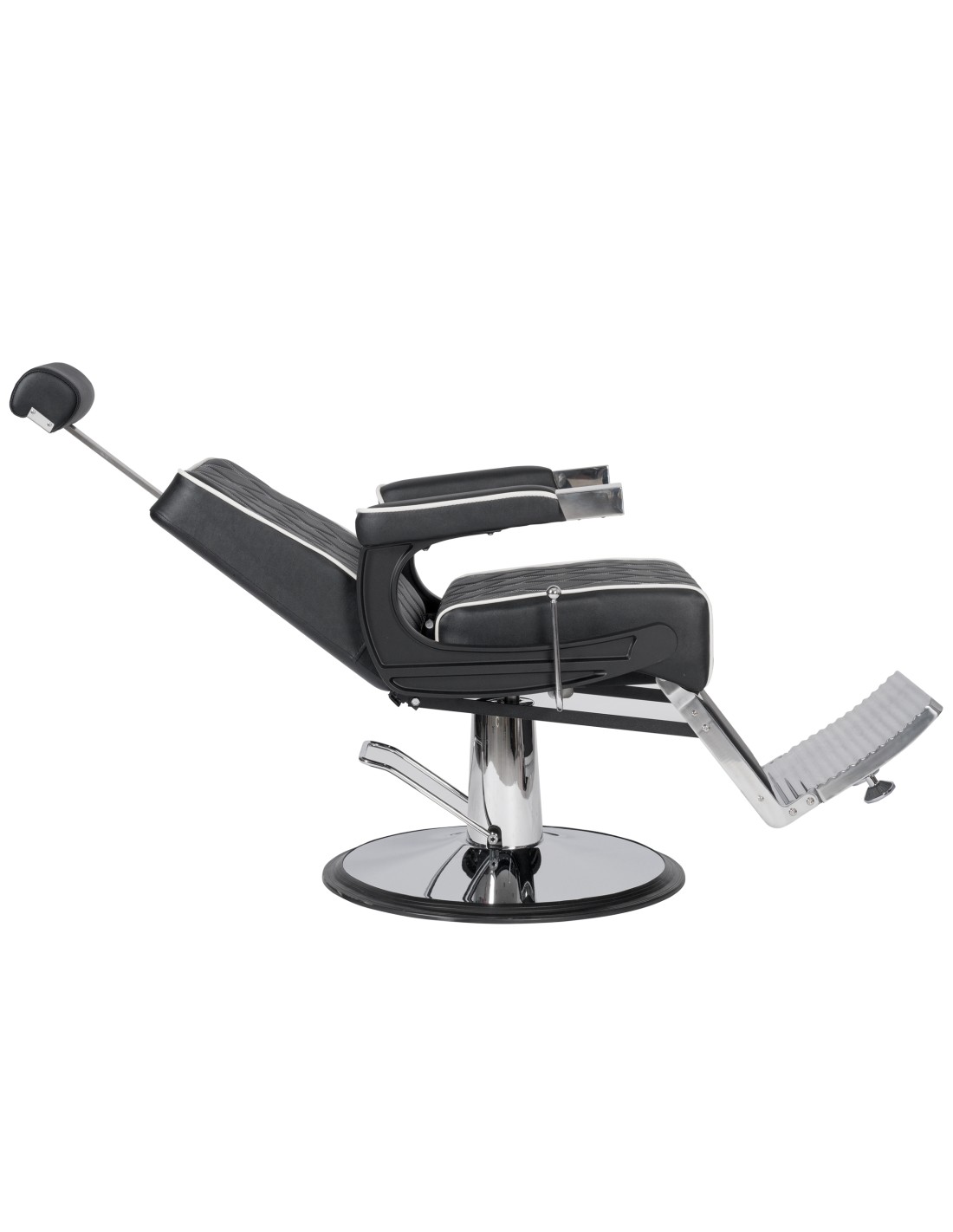 Sillón de barbería elegante, con un chasis a partir de piezas de inyección de aluminio y con una estructura interior metálica. Base redonda cromada. Asiento con espuma de alta densidad para el máximo confort y durabilidad. Acabado del tapizado con costuras blancas