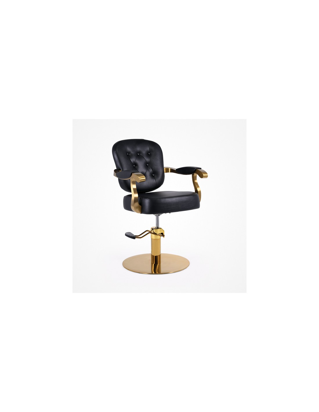 Sillon tocador tapizado serie negro NG3 con base redonda plana dorada , bomba hidraulica dorada, reposapie opcional , reposabrazos material de acero inosidable