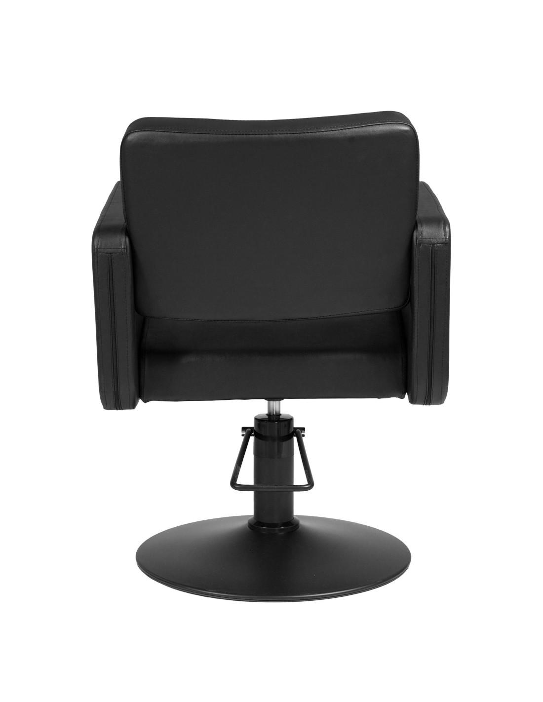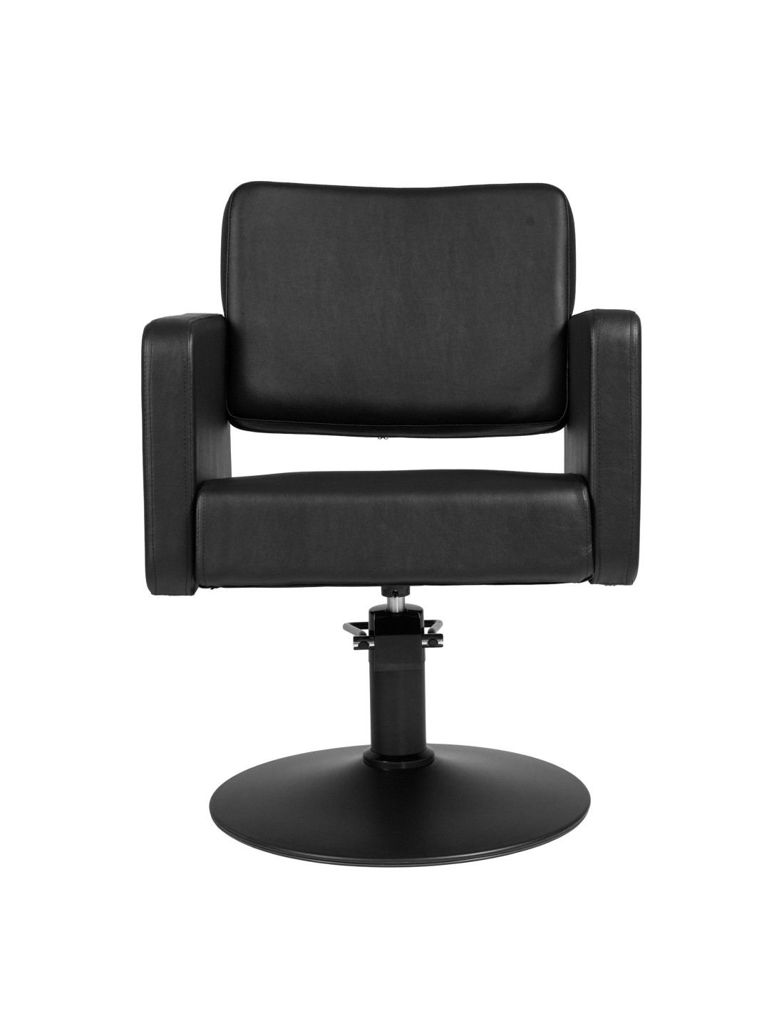 Silla de corte cómoda, con espuma de inyección de poliuretano y estructura interior metálica con muelles para ofrecer un gran confort. Base redonda muy fina para mayor comodidad para el profesional, acabada en metal negro mate. Bomba hidráulica bloqueable con freno de alta calidad. Tapizado negro.