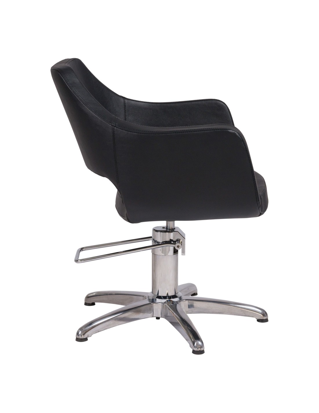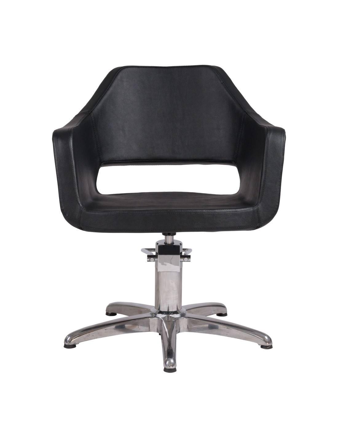 Silla de corte cómoda, con espuma de inyección de poliuretano de alta densidad y con estructura interior metálica. Base estrella de inyección de aluminio cromada. Bomba hidráulica bloqueable con freno de alta calidad. Tapizado negro.