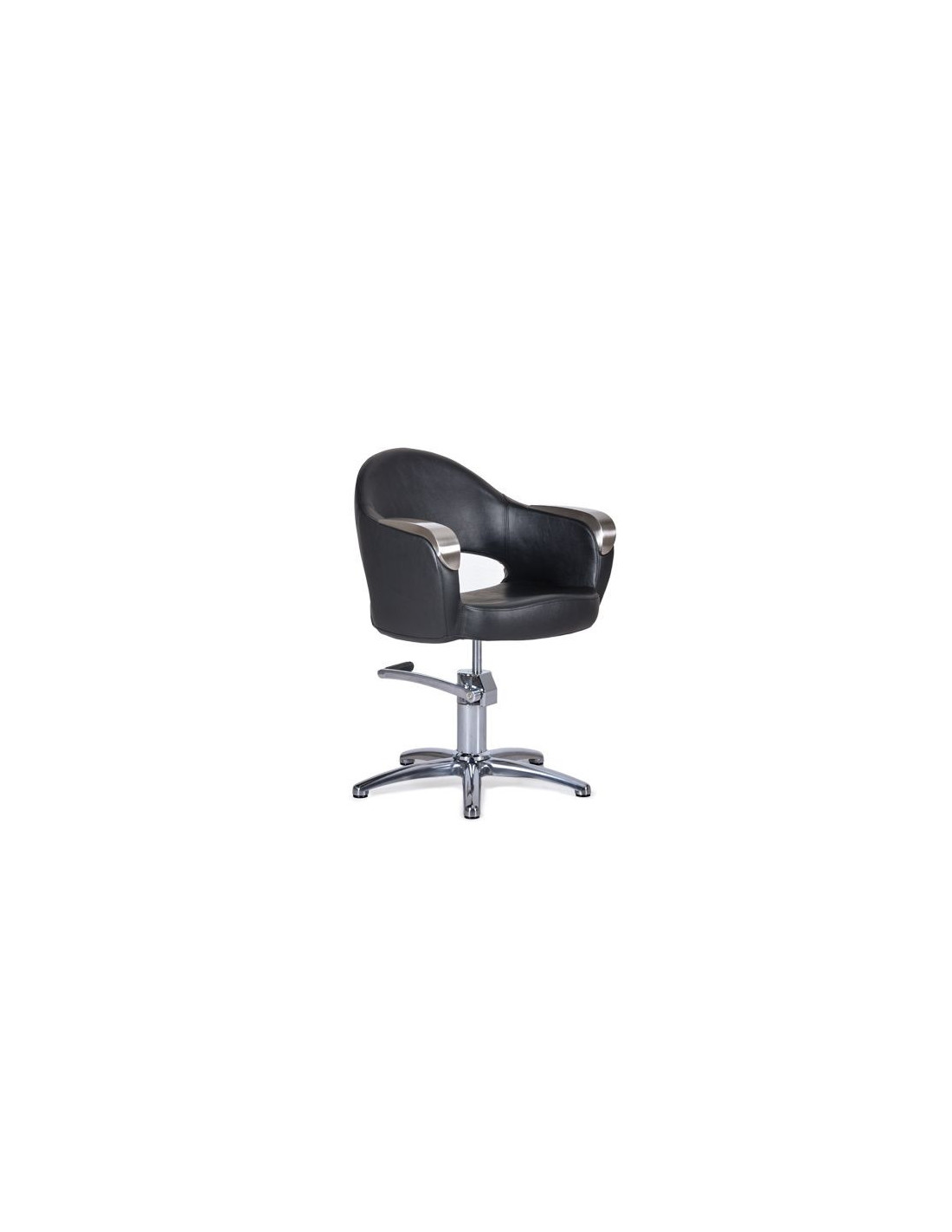 Altura regulable mediante bomba hidráulica con freno. Tapizado en color negro con adornos en aluminio en los apoyabrazos. Pie en aluminio con forma de estrella.