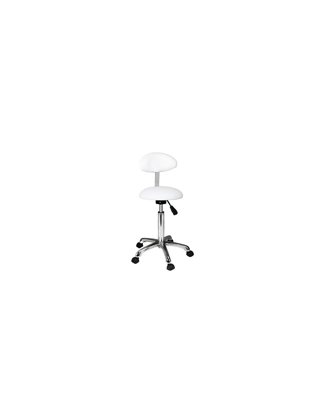Taburete con respaldo ovalado de diseño ergonómico y elegante. Asiento en forma de media esfera y altura regulable mediante pistón de gas. Base cromada con ruedas.