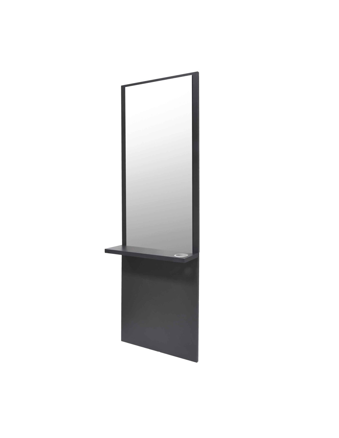 Fabricado en melamina. Espejo canteado 5mm. Práctico estante para los utensilios y aro para el secador.