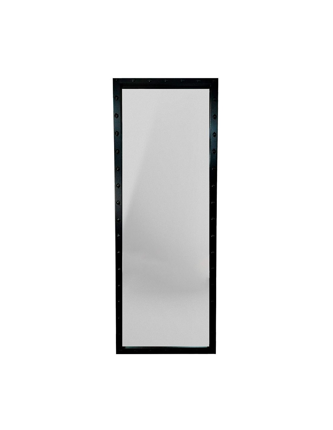 Tocador para salones de peluquería y barberías, con marco metálico negro de 5 mm de grosor y remaches metálicos de adorno. Espejo de cuerpo completo: 180cm de alto.