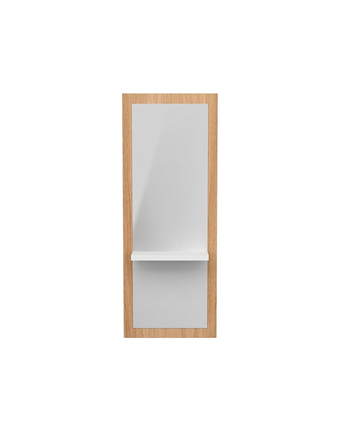 Tocador para peluquerías y salones de barbería. Estructura interna de tablero aglomerado de alta densidad, y acabado con lámina de melamina de color roble. Con estante o bandeja para colocar utensilios de color blanco. Espejo de gran resistencia de grosor 4 mm