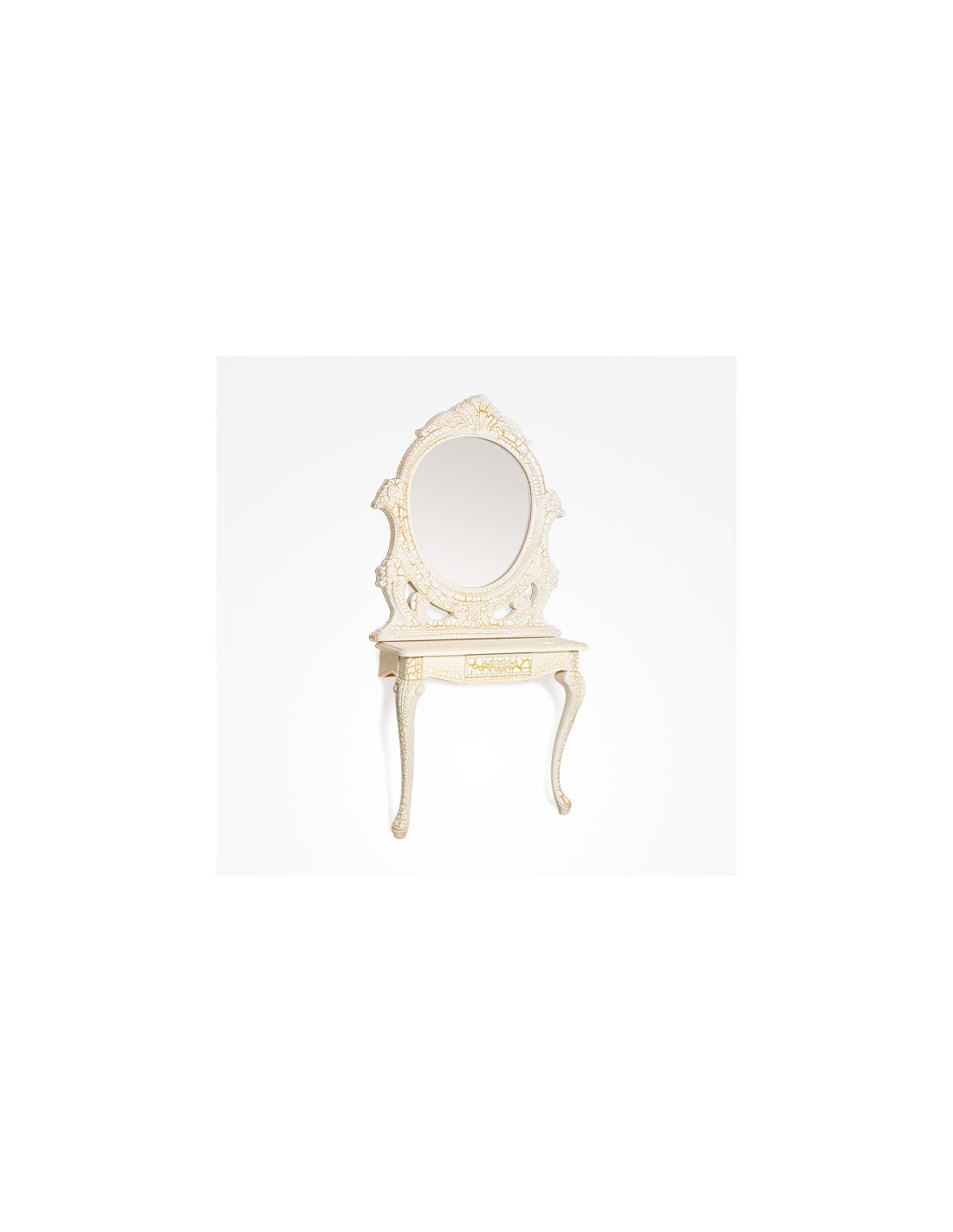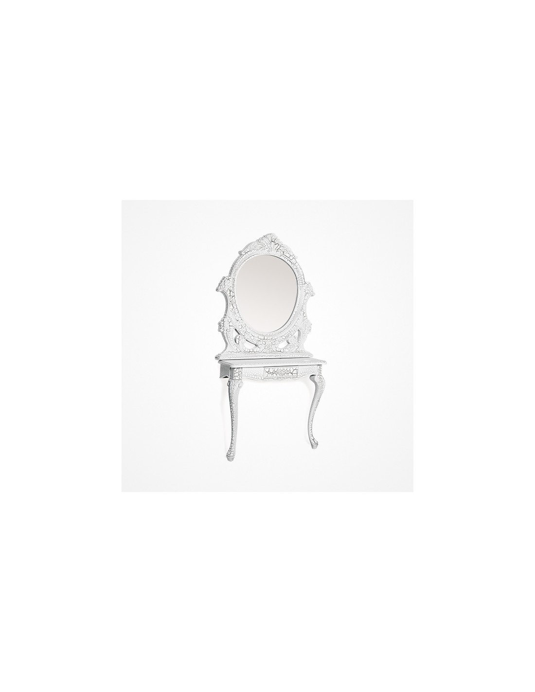 Espejo ovalado y marco decorado. Tocador de pared disponible en gris o dorado envejecido. Con un pequeño cajón en la encimera. Por su diseño y estilo se adapta a cualquier gabinete de estética.